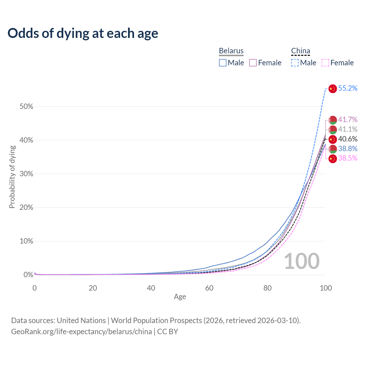 This life expectancy calculator shows the odds of living to 100, 95, 90, and below based on current age for both males and females in Belarus and China, along with mean and median age of death. The calculations are based on the 2026 life tables (actuarial tables) from the UN World Population Prospects.
