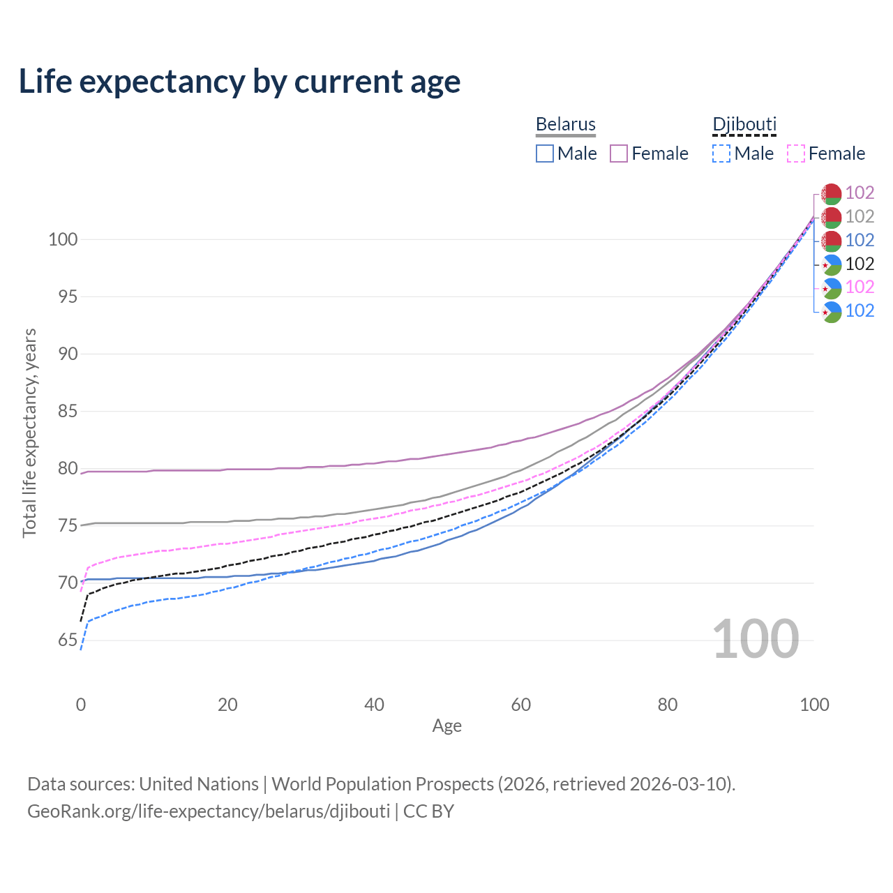 This life expectancy calculator shows the odds of living to 100, 95, 90, and below based on current age for both males and females in Belarus and Djibouti, along with mean and median age of death. The calculations are based on the 2026 life tables (actuarial tables) from the UN World Population Prospects.