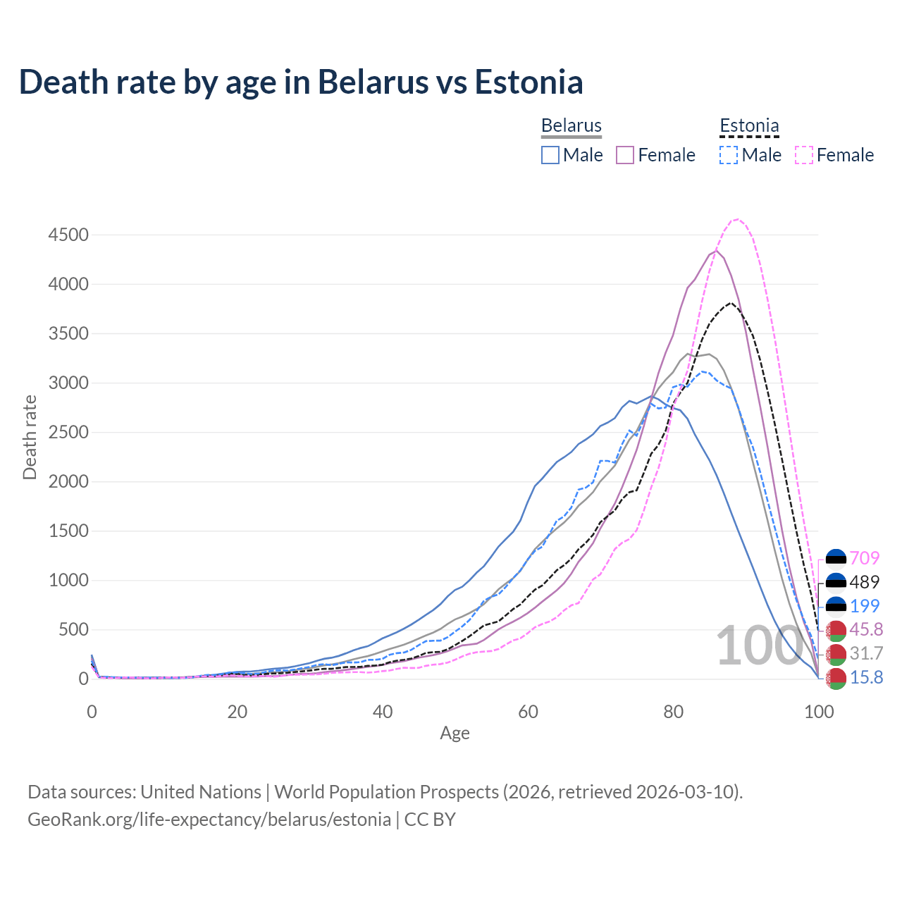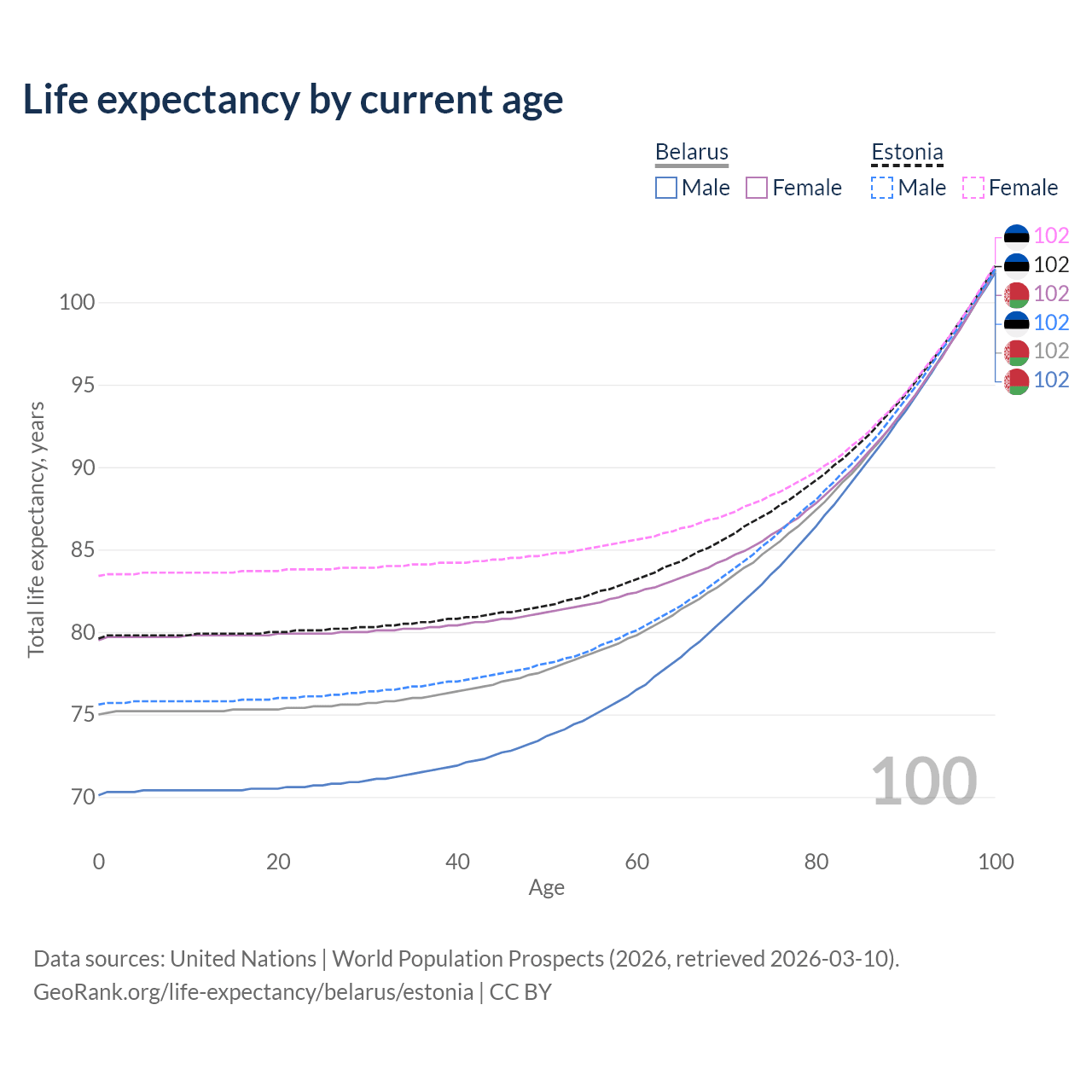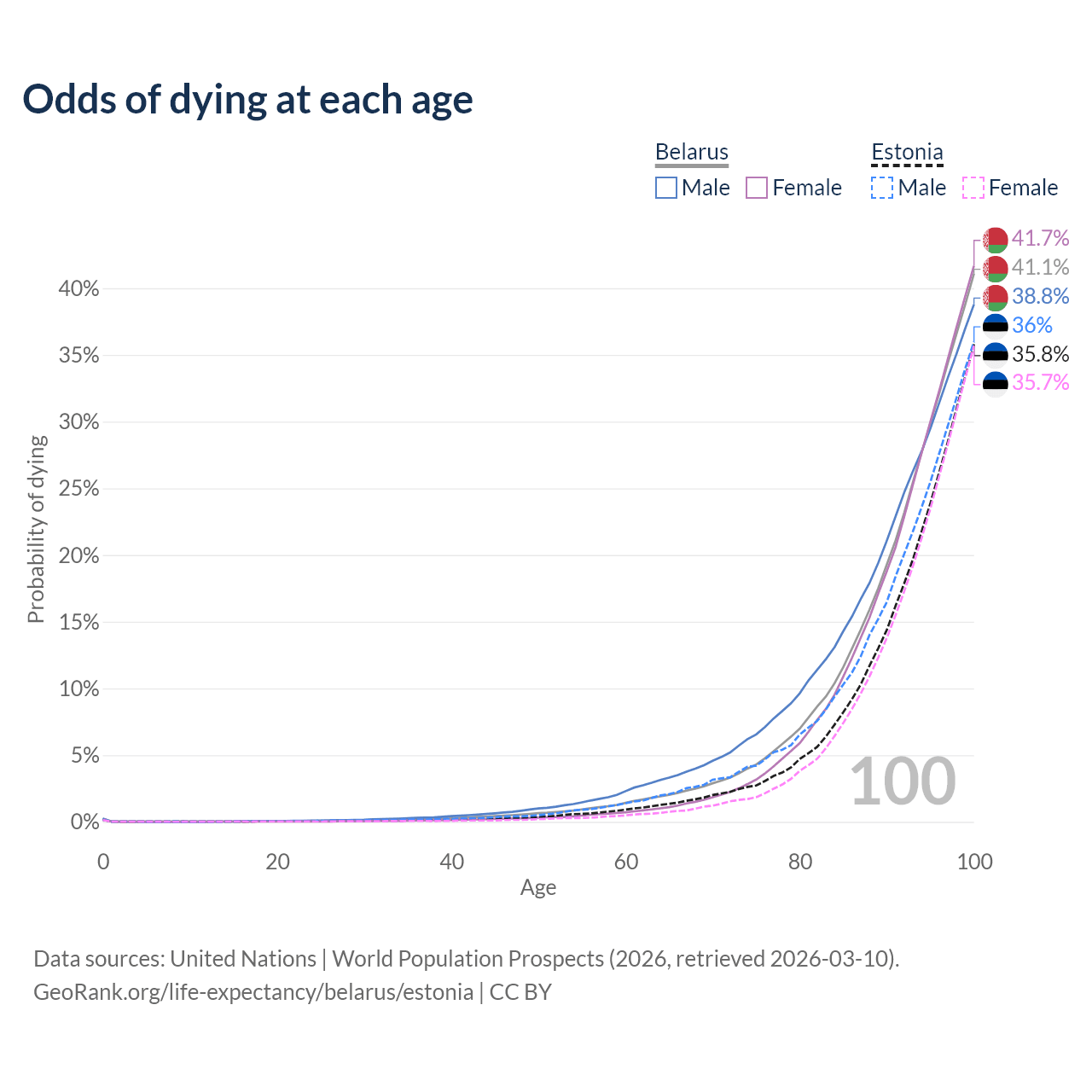 This life expectancy calculator shows the odds of living to 100, 95, 90, and below based on current age for both males and females in Belarus and Estonia, along with mean and median age of death. The calculations are based on the 2026 life tables (actuarial tables) from the UN World Population Prospects.
