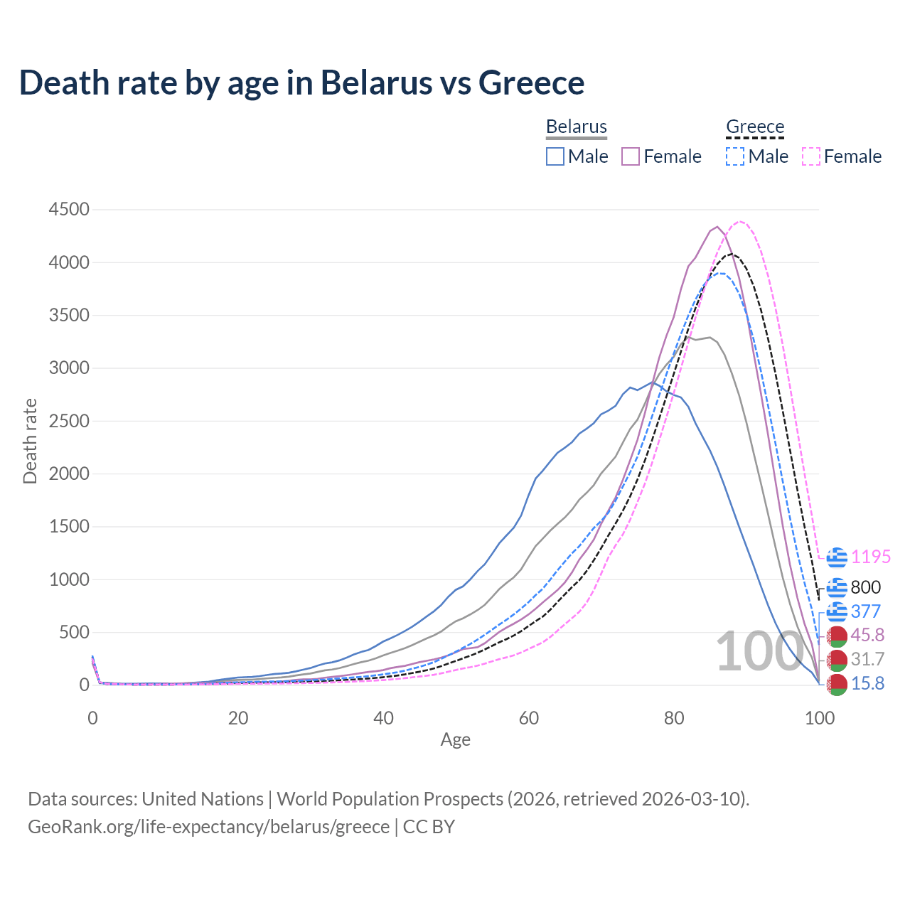 In Belarus, the most common age of death is 82, compared to 88 in Greece. The median age of death is 78.1 in Belarus and 84.9 in Greece, meaning only half of each cohort is expected to live past that age.