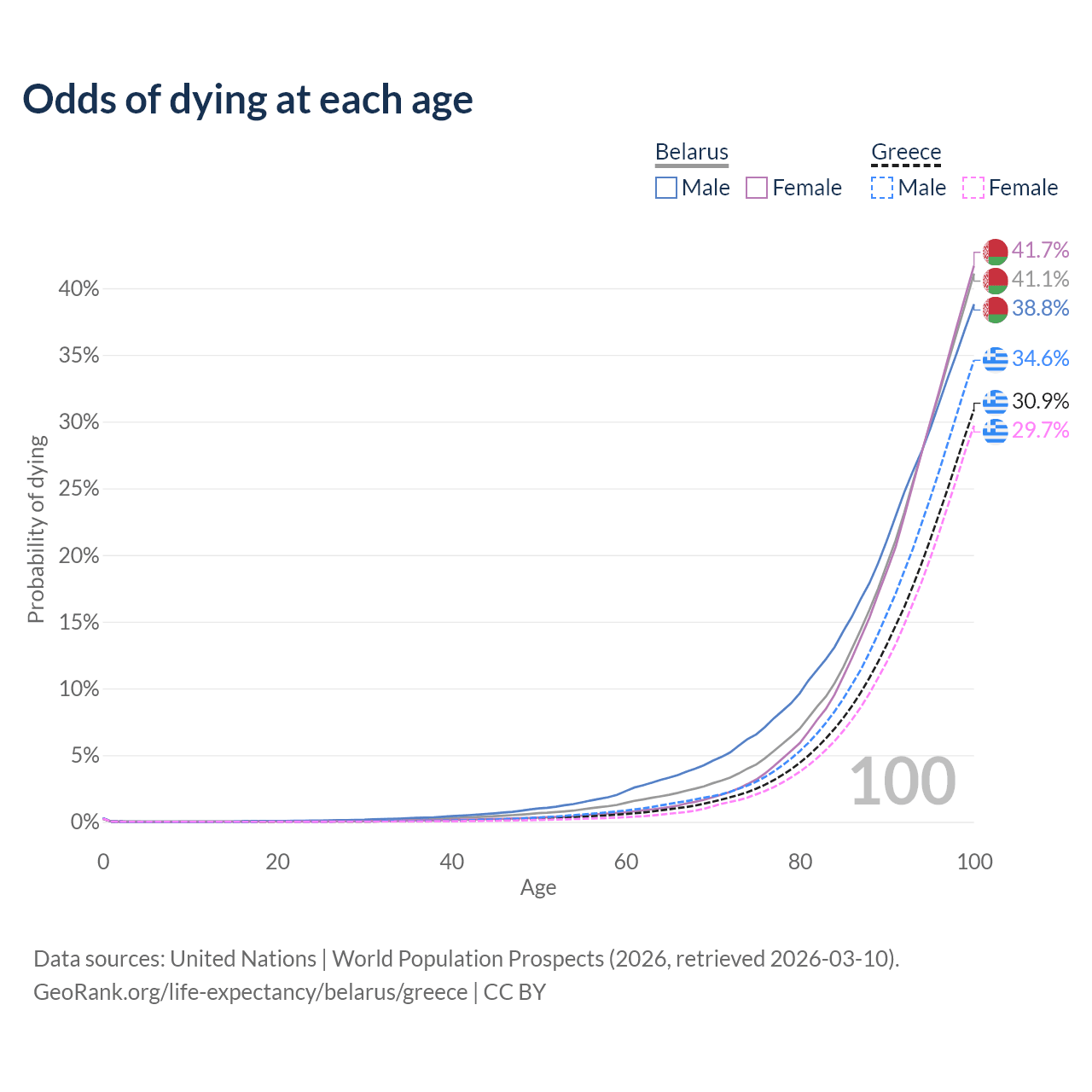 This life expectancy calculator shows the odds of living to 100, 95, 90, and below based on current age for both males and females in Belarus and Greece, along with mean and median age of death. The calculations are based on the 2026 life tables (actuarial tables) from the UN World Population Prospects.