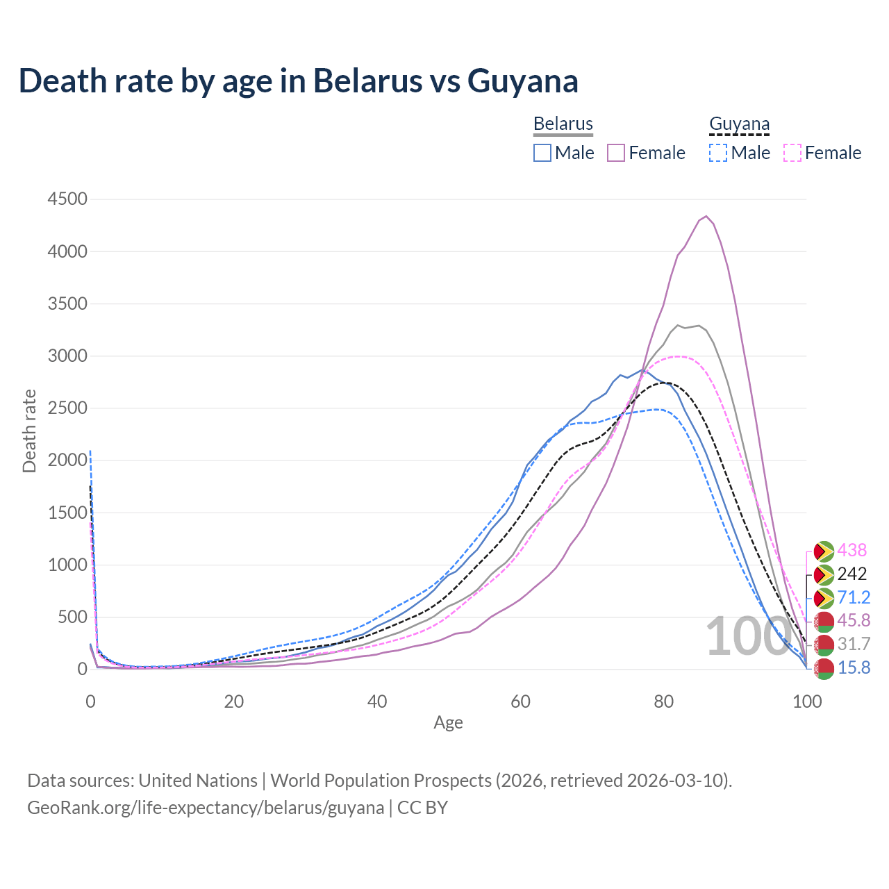 In Belarus, the most common age of death is 82, compared to 80 in Guyana. The median age of death is 78.1 in Belarus and 74.1 in Guyana, meaning only half of each cohort is expected to live past that age.