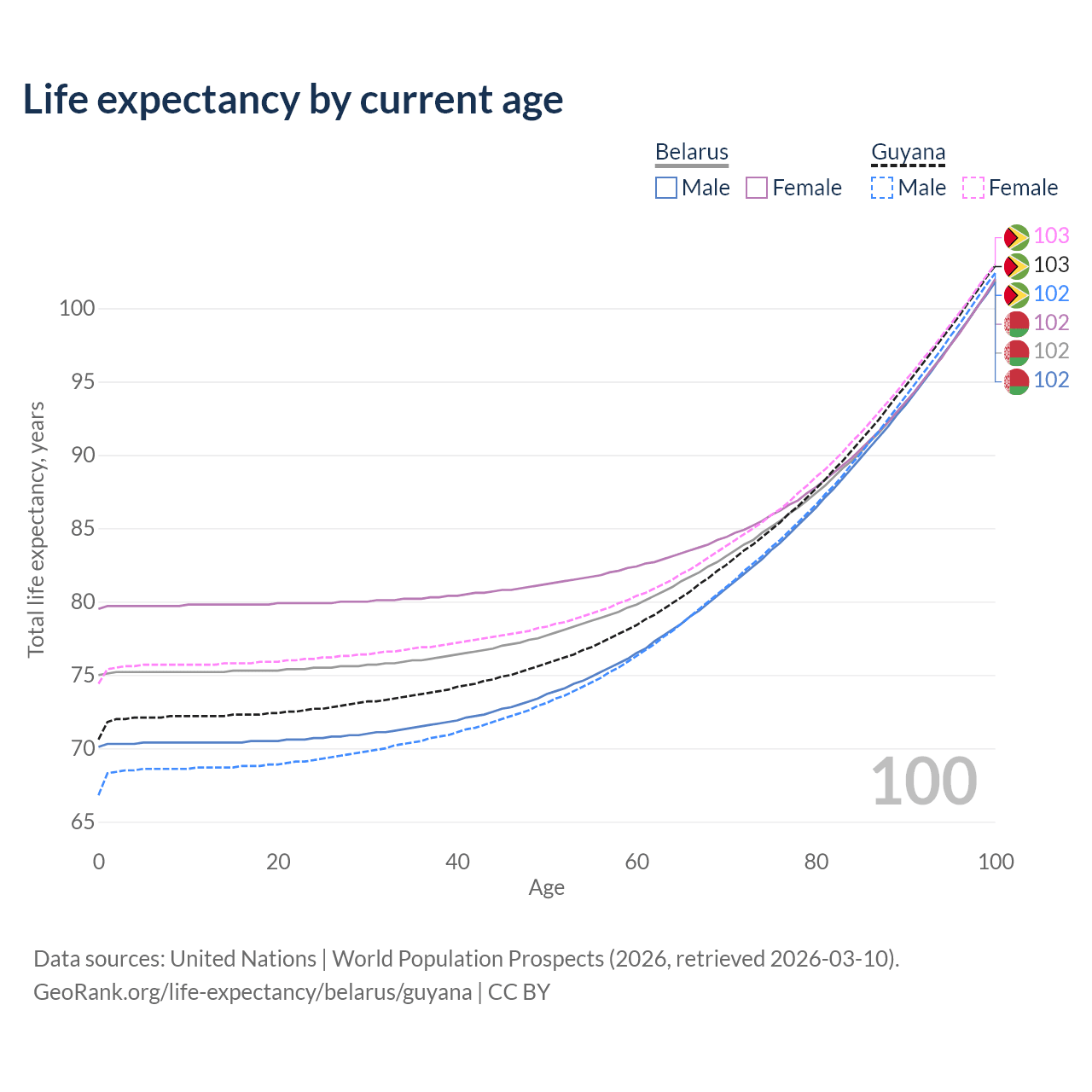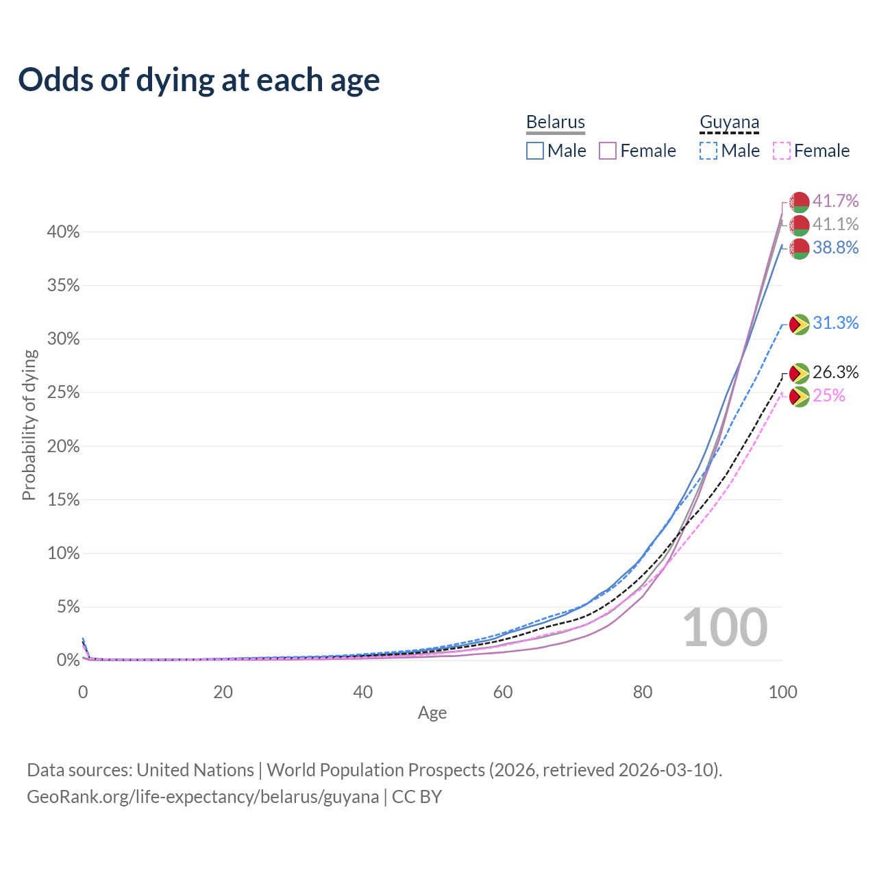 This life expectancy calculator shows the odds of living to 100, 95, 90, and below based on current age for both males and females in Belarus and Guyana, along with mean and median age of death. The calculations are based on the 2026 life tables (actuarial tables) from the UN World Population Prospects.