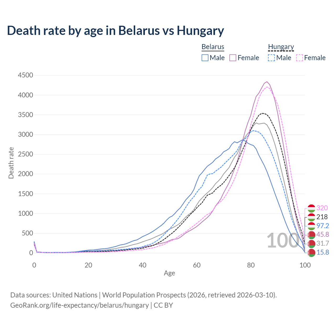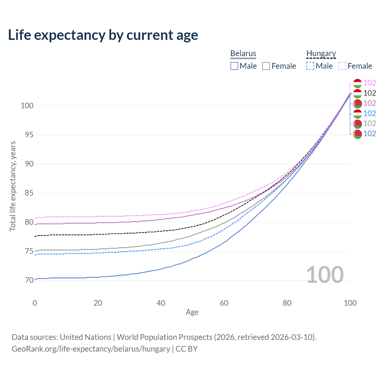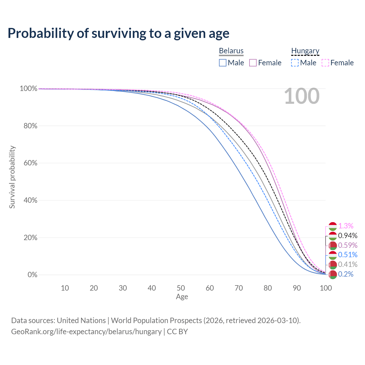 This life expectancy calculator shows the odds of living to 100, 95, 90, and below based on current age for both males and females in Belarus and Hungary, along with mean and median age of death. The calculations are based on the 2026 life tables (actuarial tables) from the UN World Population Prospects.