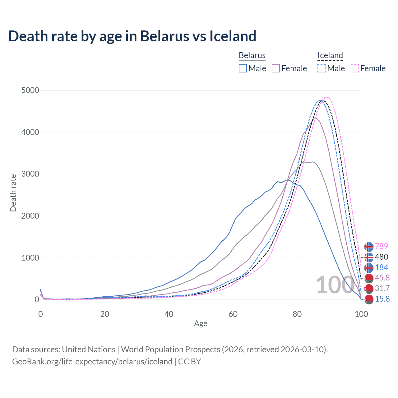 This life expectancy calculator shows the odds of living to 100, 95, 90, and below based on current age for both males and females in Belarus and Iceland, along with mean and median age of death. The calculations are based on the 2026 life tables (actuarial tables) from the UN World Population Prospects.