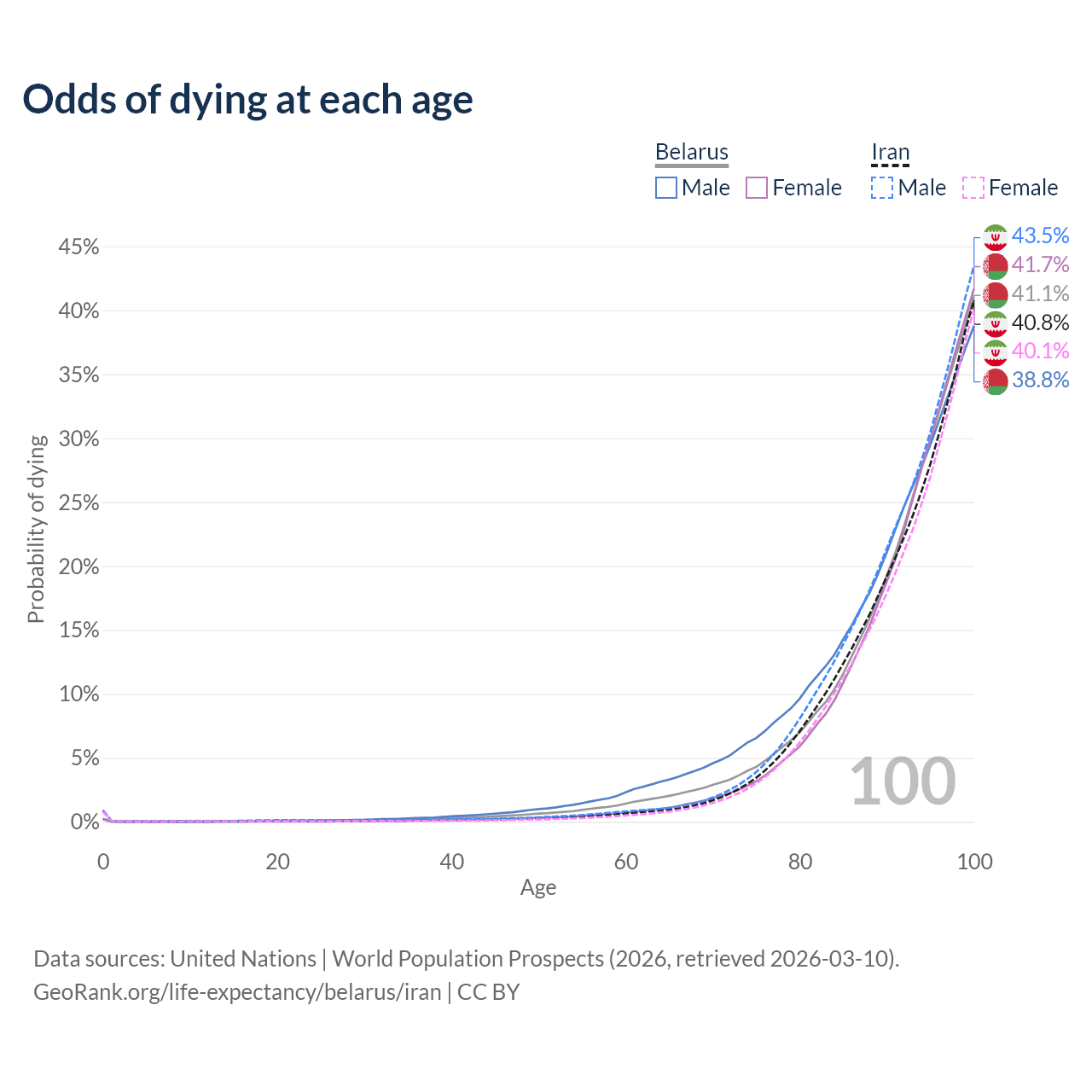 This life expectancy calculator shows the odds of living to 100, 95, 90, and below based on current age for both males and females in Belarus and Iran, along with mean and median age of death. The calculations are based on the 2026 life tables (actuarial tables) from the UN World Population Prospects.
