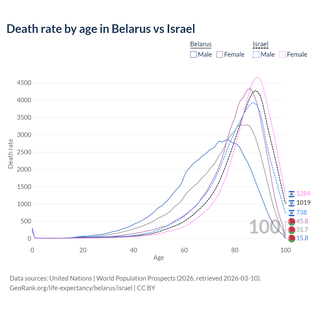 In Belarus, the most common age of death is 82, compared to 88 in Israel. The median age of death is 78.1 in Belarus and 85.6 in Israel, meaning only half of each cohort is expected to live past that age.