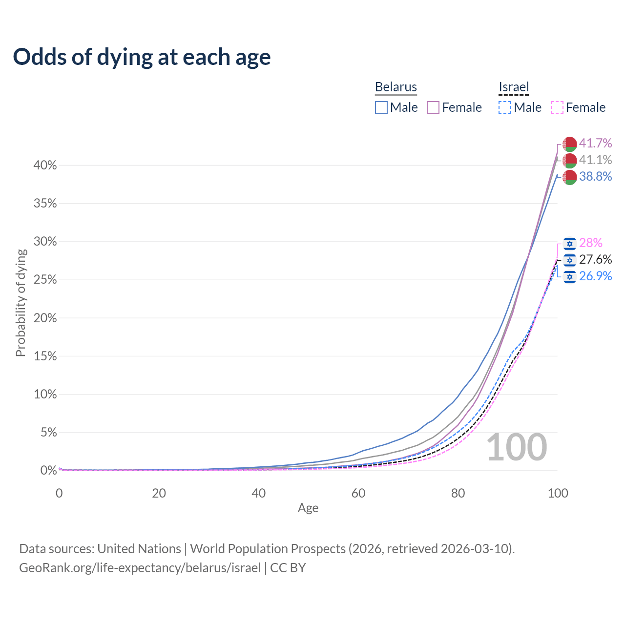 This life expectancy calculator shows the odds of living to 100, 95, 90, and below based on current age for both males and females in Belarus and Israel, along with mean and median age of death. The calculations are based on the 2026 life tables (actuarial tables) from the UN World Population Prospects.