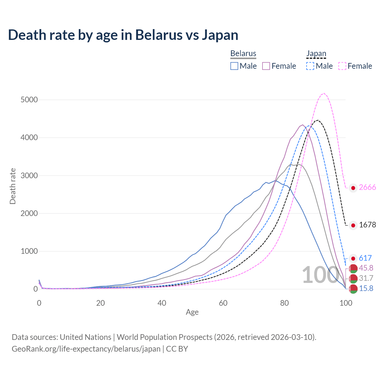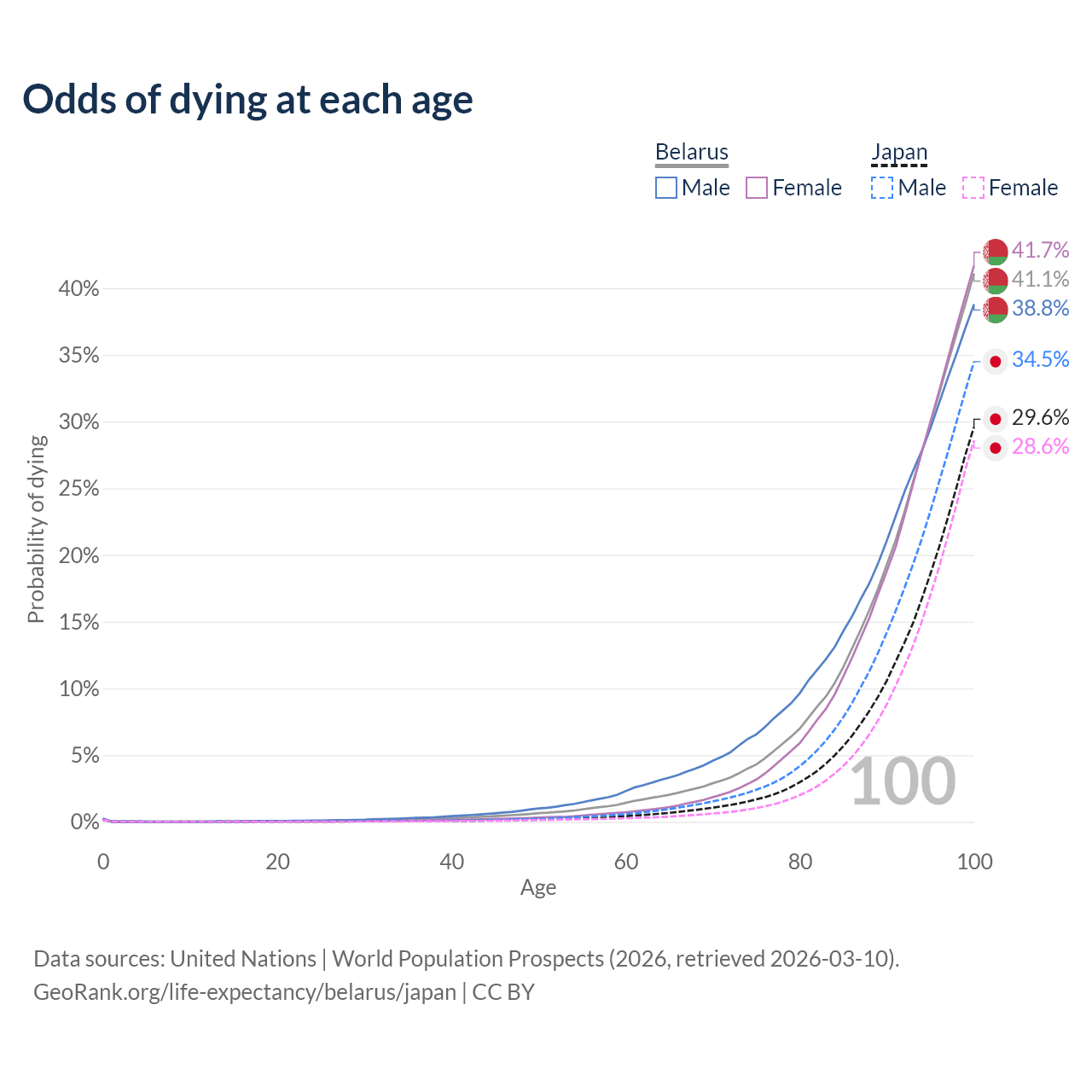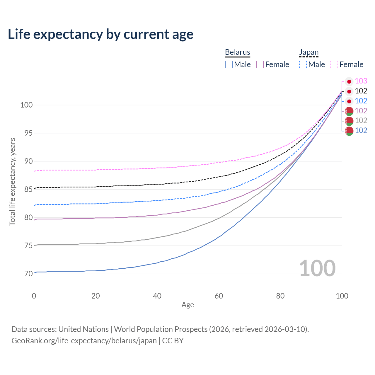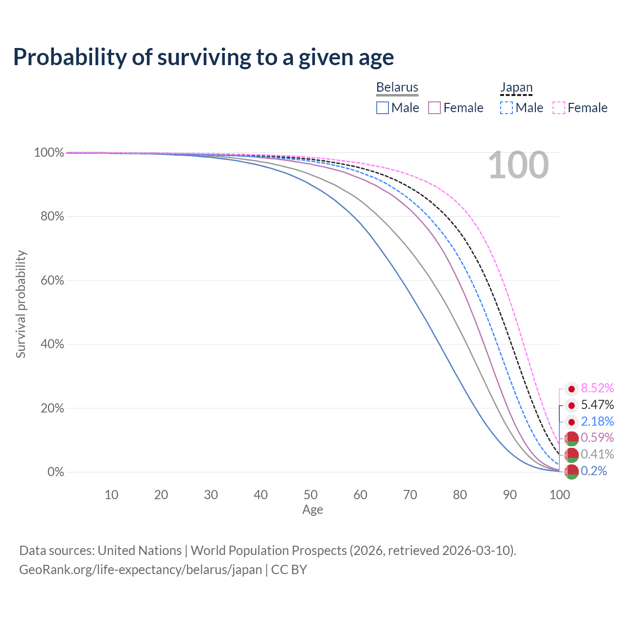 This life expectancy calculator shows the odds of living to 100, 95, 90, and below based on current age for both males and females in Belarus and Japan, along with mean and median age of death. The calculations are based on the 2026 life tables (actuarial tables) from the UN World Population Prospects.