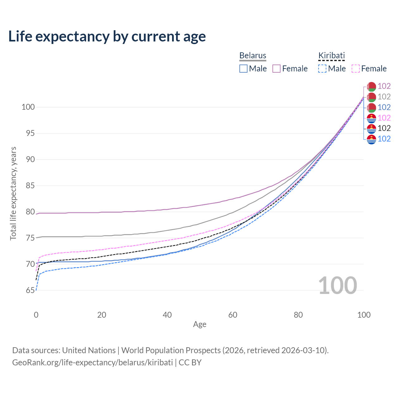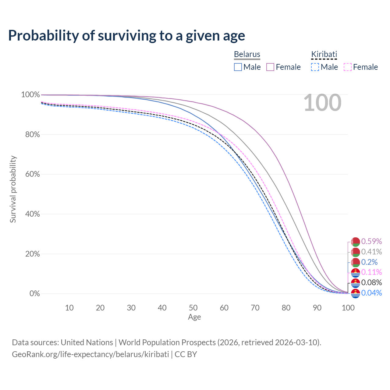 This life expectancy calculator shows the odds of living to 100, 95, 90, and below based on current age for both males and females in Belarus and Kiribati, along with mean and median age of death. The calculations are based on the 2026 life tables (actuarial tables) from the UN World Population Prospects.