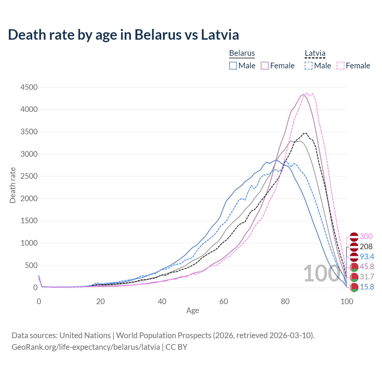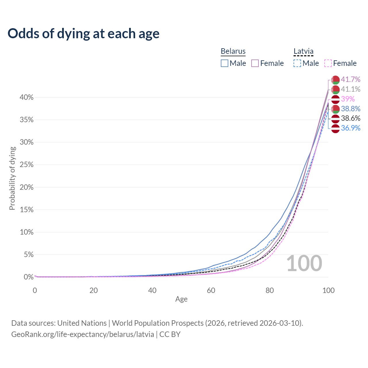 This life expectancy calculator shows the odds of living to 100, 95, 90, and below based on current age for both males and females in Belarus and Latvia, along with mean and median age of death. The calculations are based on the 2026 life tables (actuarial tables) from the UN World Population Prospects.