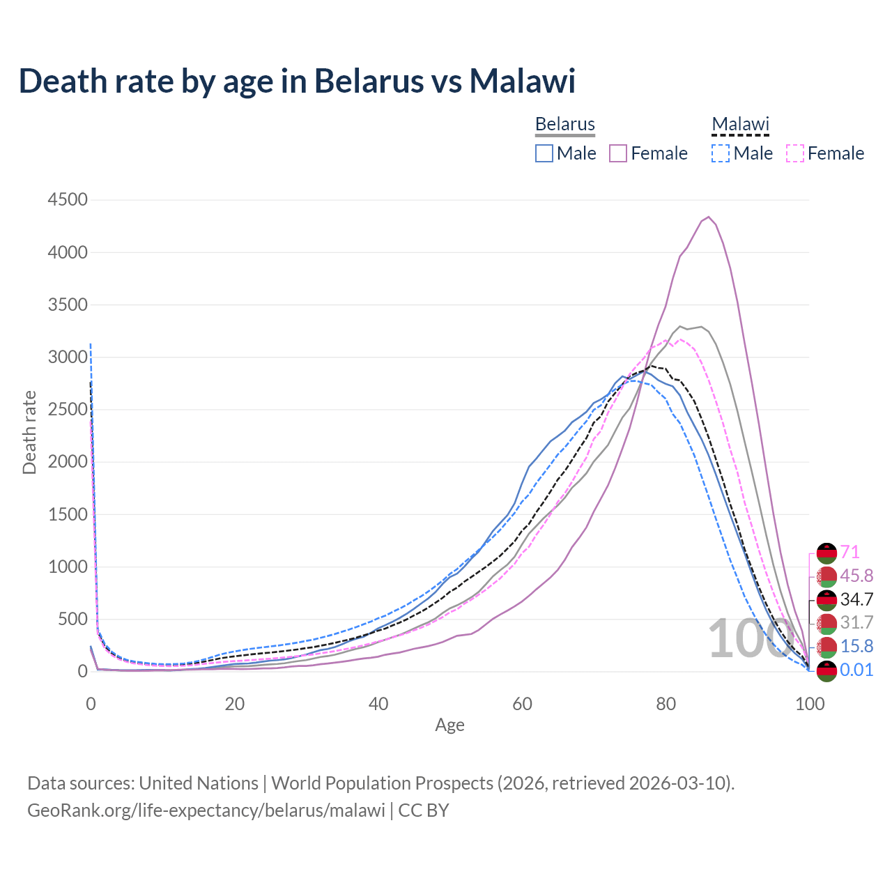 This life expectancy calculator shows the odds of living to 100, 95, 90, and below based on current age for both males and females in Belarus and Malawi, along with mean and median age of death. The calculations are based on the 2026 life tables (actuarial tables) from the UN World Population Prospects.