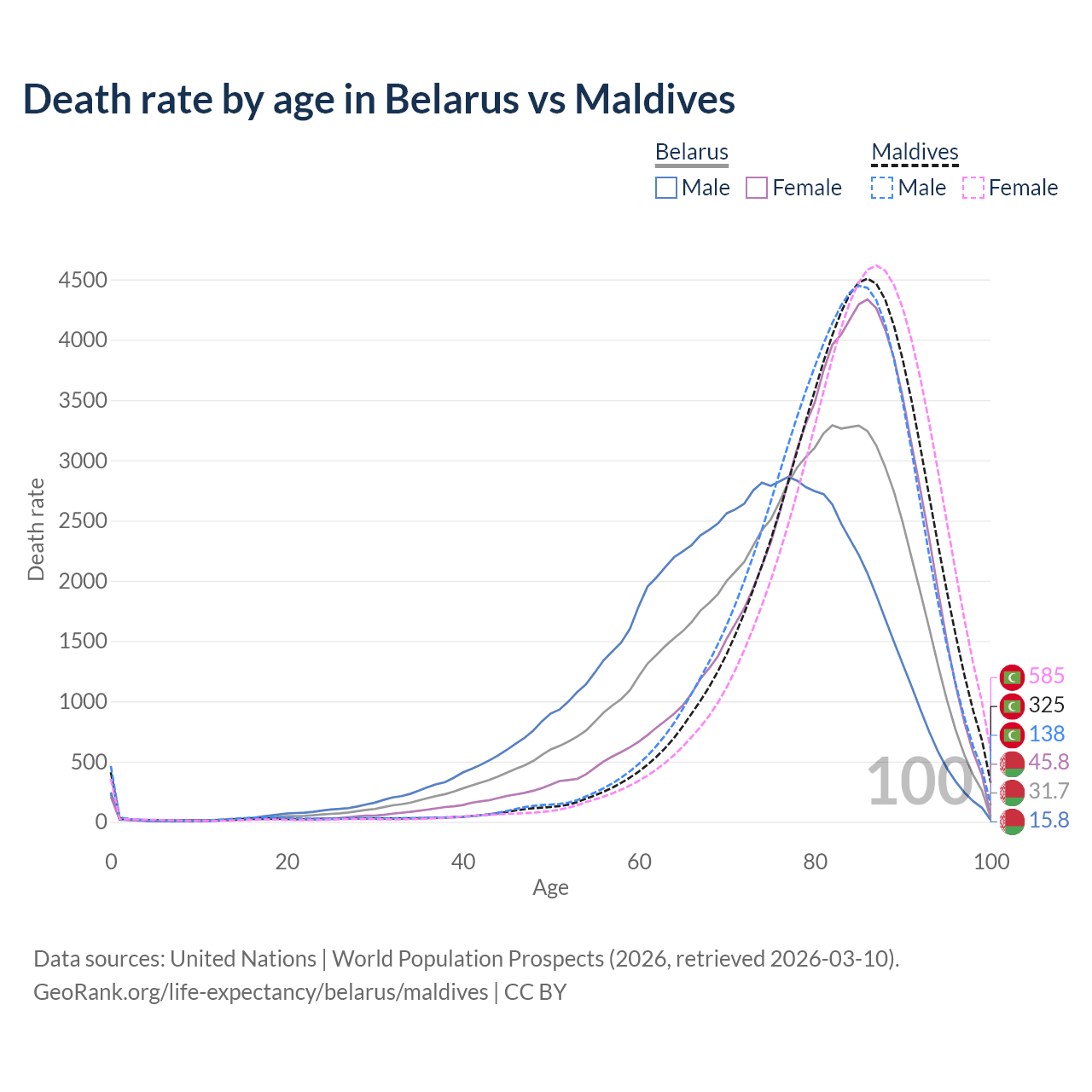 In Belarus, the most common age of death is 82, compared to 86 in Maldives. The median age of death is 78.1 in Belarus and 83.8 in Maldives, meaning only half of each cohort is expected to live past that age.