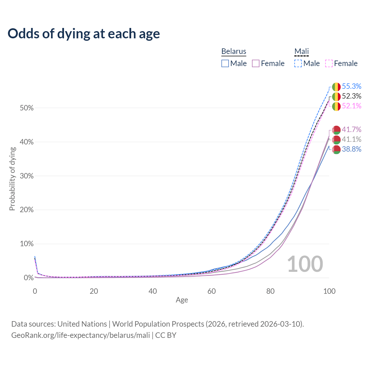 This life expectancy calculator shows the odds of living to 100, 95, 90, and below based on current age for both males and females in Belarus and Mali, along with mean and median age of death. The calculations are based on the 2026 life tables (actuarial tables) from the UN World Population Prospects.