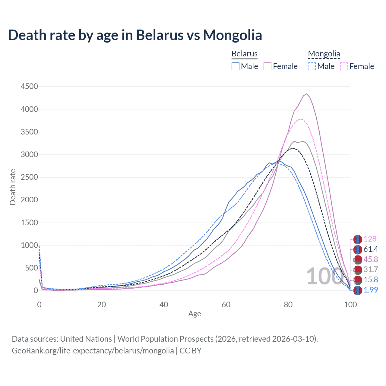In Belarus, the most common age of death is 82, compared to 82 in Mongolia. The median age of death is 78.1 in Belarus and 76 in Mongolia, meaning only half of each cohort is expected to live past that age.