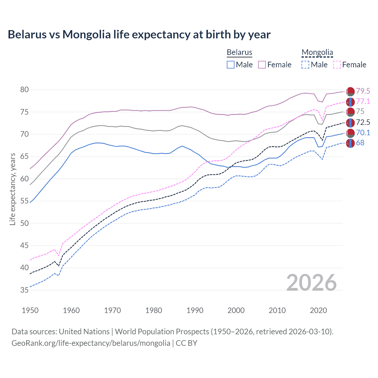 The average life expectancy at birth is 75 years in Belarus vs 72.5 in Mongolia. Belarus is ranked 97/197 by life expectancy, and Mongolia is 120/197. In Belarus, the life expectancy is 70.1 years for males and 79.5 years for females. In Mongolia, it's 68 years for males and 77.1 years for females.