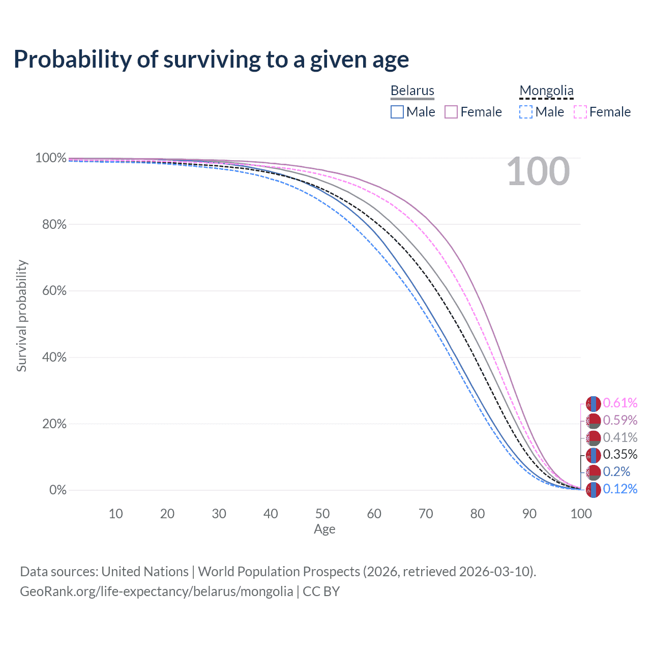 This life expectancy calculator shows the odds of living to 100, 95, 90, and below based on current age for both males and females in Belarus and Mongolia, along with mean and median age of death. The calculations are based on the 2026 life tables (actuarial tables) from the UN World Population Prospects.