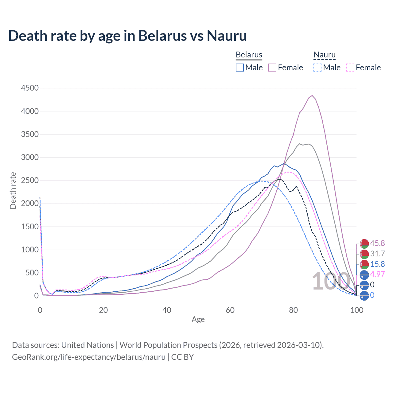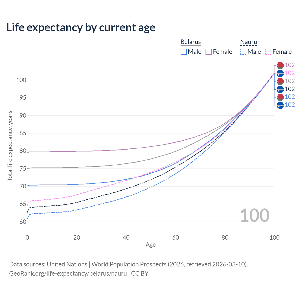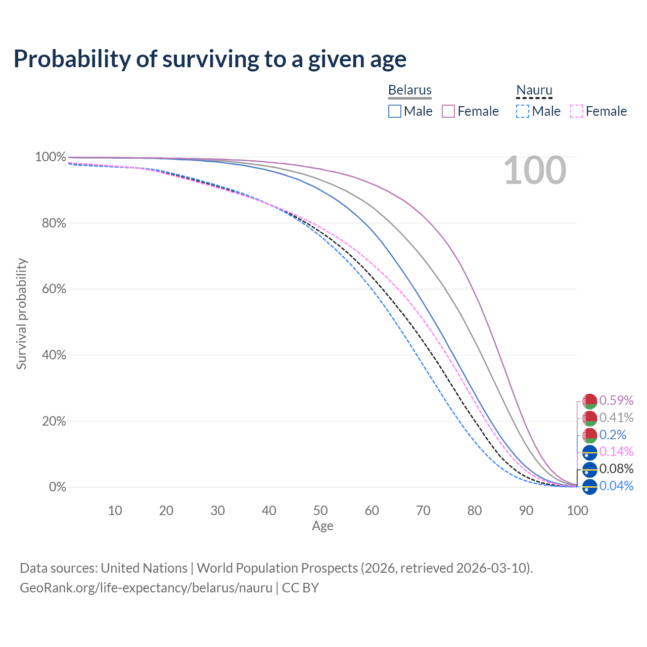 This life expectancy calculator shows the odds of living to 100, 95, 90, and below based on current age for both males and females in Belarus and Nauru, along with mean and median age of death. The calculations are based on the 2026 life tables (actuarial tables) from the UN World Population Prospects.