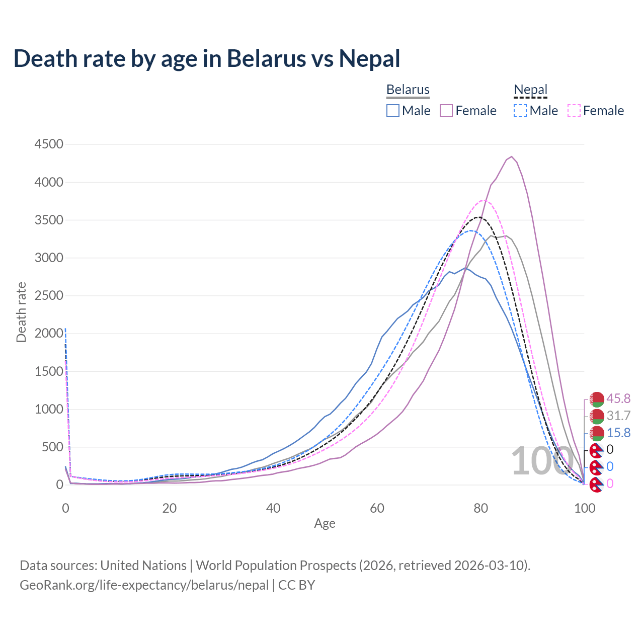 In Belarus, the most common age of death is 82, compared to 80 in Nepal. The median age of death is 78.1 in Belarus and 75.4 in Nepal, meaning only half of each cohort is expected to live past that age.
