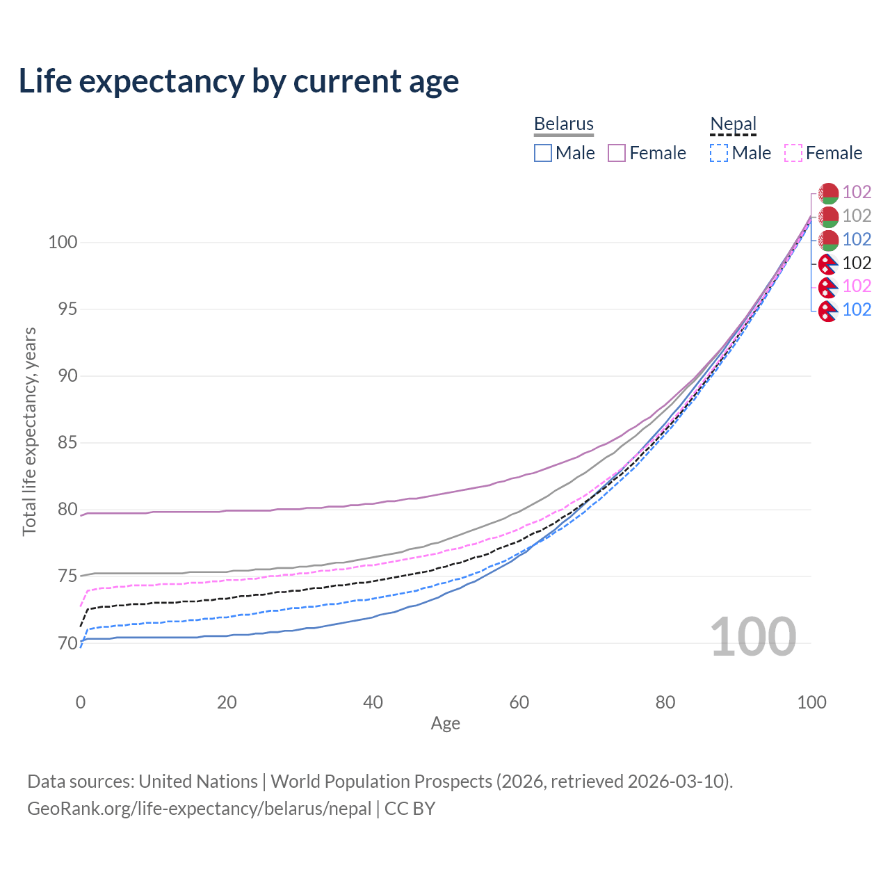 This life expectancy calculator shows the odds of living to 100, 95, 90, and below based on current age for both males and females in Belarus and Nepal, along with mean and median age of death. The calculations are based on the 2026 life tables (actuarial tables) from the UN World Population Prospects.