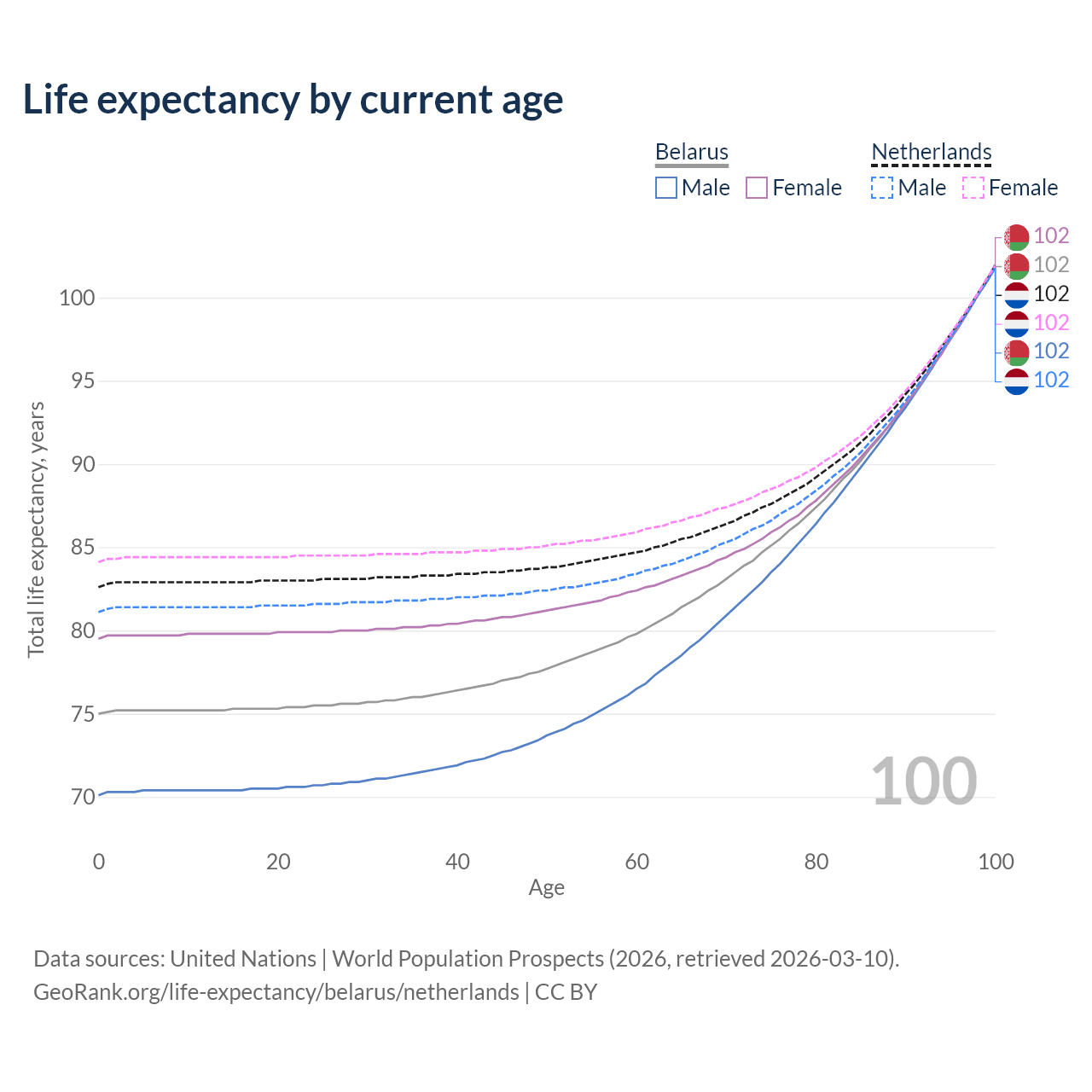 This life expectancy calculator shows the odds of living to 100, 95, 90, and below based on current age for both males and females in Belarus and the Netherlands, along with mean and median age of death. The calculations are based on the 2026 life tables (actuarial tables) from the UN World Population Prospects.