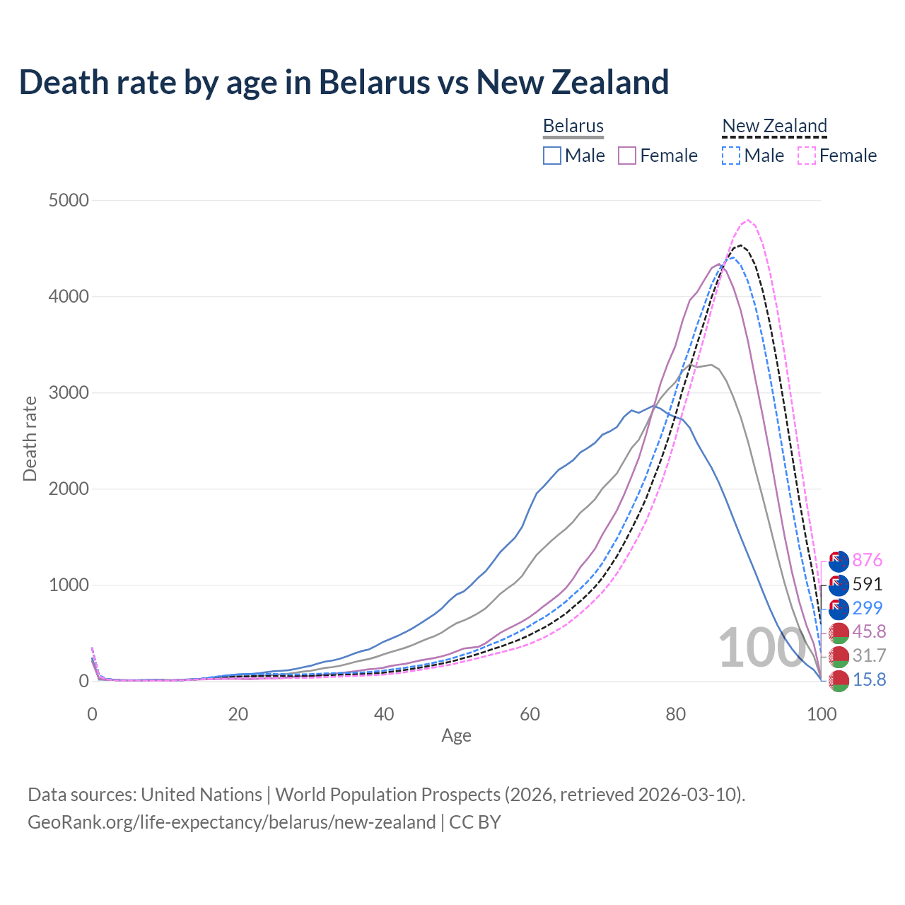 In Belarus, the most common age of death is 82, compared to 89 in New Zealand. The median age of death is 78.1 in Belarus and 85.8 in New Zealand, meaning only half of each cohort is expected to live past that age.