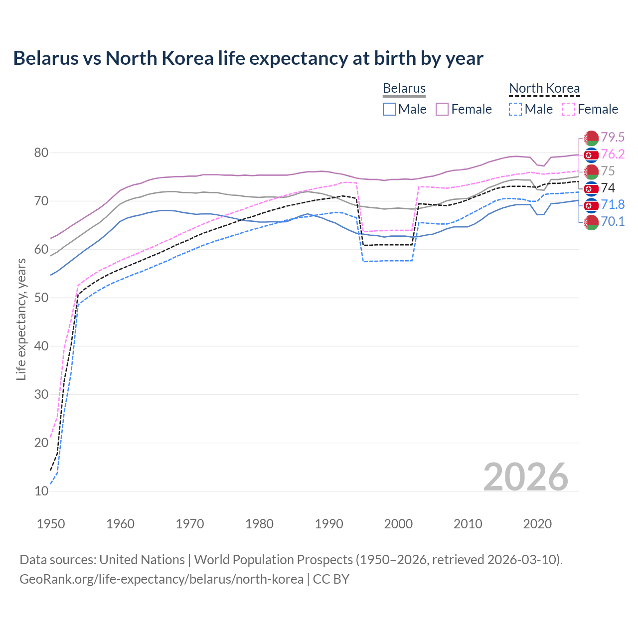 The average life expectancy at birth is 75 years in Belarus vs 74 in North Korea. Belarus is ranked 97/197 by life expectancy, and North Korea is 104/197. In Belarus, the life expectancy is 70.1 years for males and 79.5 years for females. In North Korea, it's 71.8 years for males and 76.2 years for females.