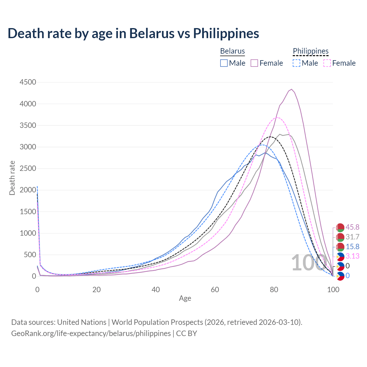 This life expectancy calculator shows the odds of living to 100, 95, 90, and below based on current age for both males and females in Belarus and the Philippines, along with mean and median age of death. The calculations are based on the 2026 life tables (actuarial tables) from the UN World Population Prospects.