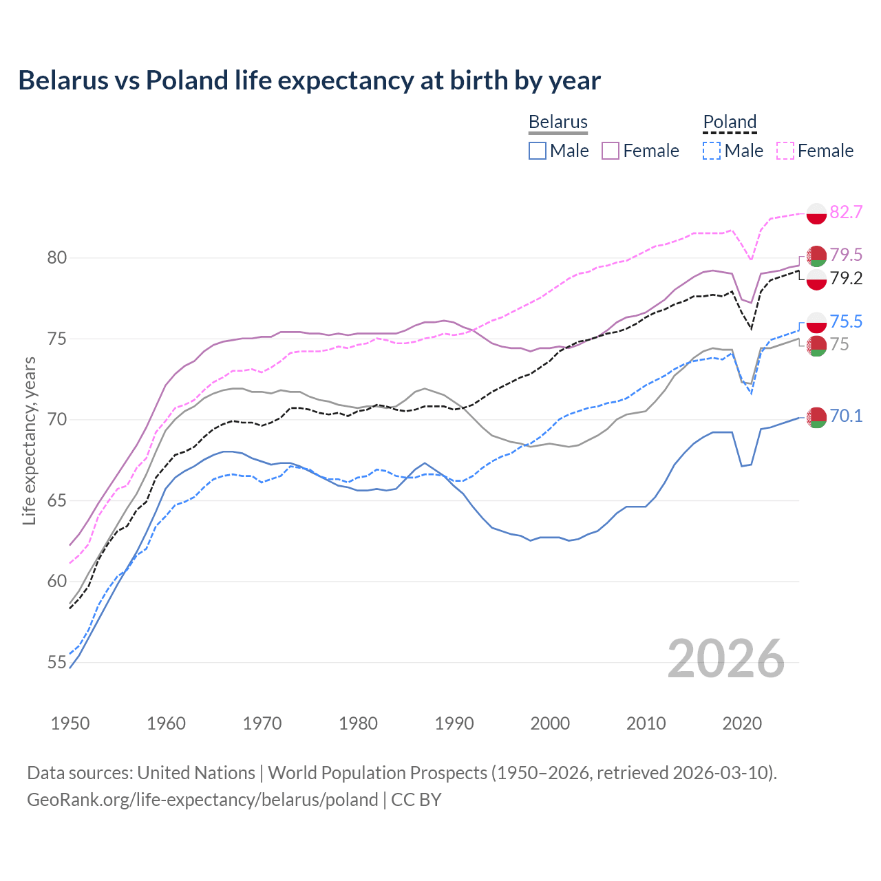 The average life expectancy at birth is 75 years in Belarus vs 79.2 in Poland. Belarus is ranked 97/197 by life expectancy, and Poland is 50/197. In Belarus, the life expectancy is 70.1 years for males and 79.5 years for females. In Poland, it's 75.5 years for males and 82.7 years for females.