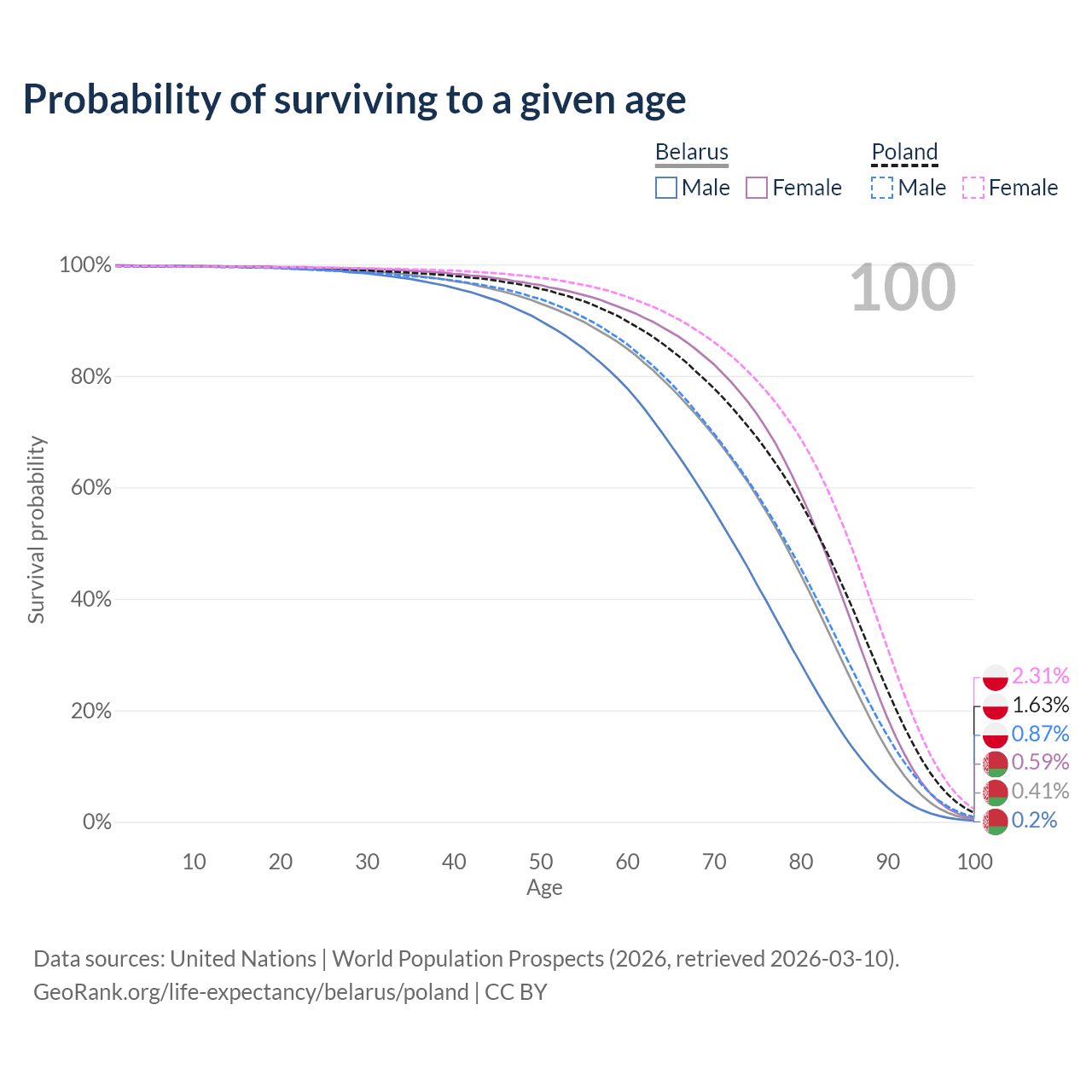 This life expectancy calculator shows the odds of living to 100, 95, 90, and below based on current age for both males and females in Belarus and Poland, along with mean and median age of death. The calculations are based on the 2026 life tables (actuarial tables) from the UN World Population Prospects.