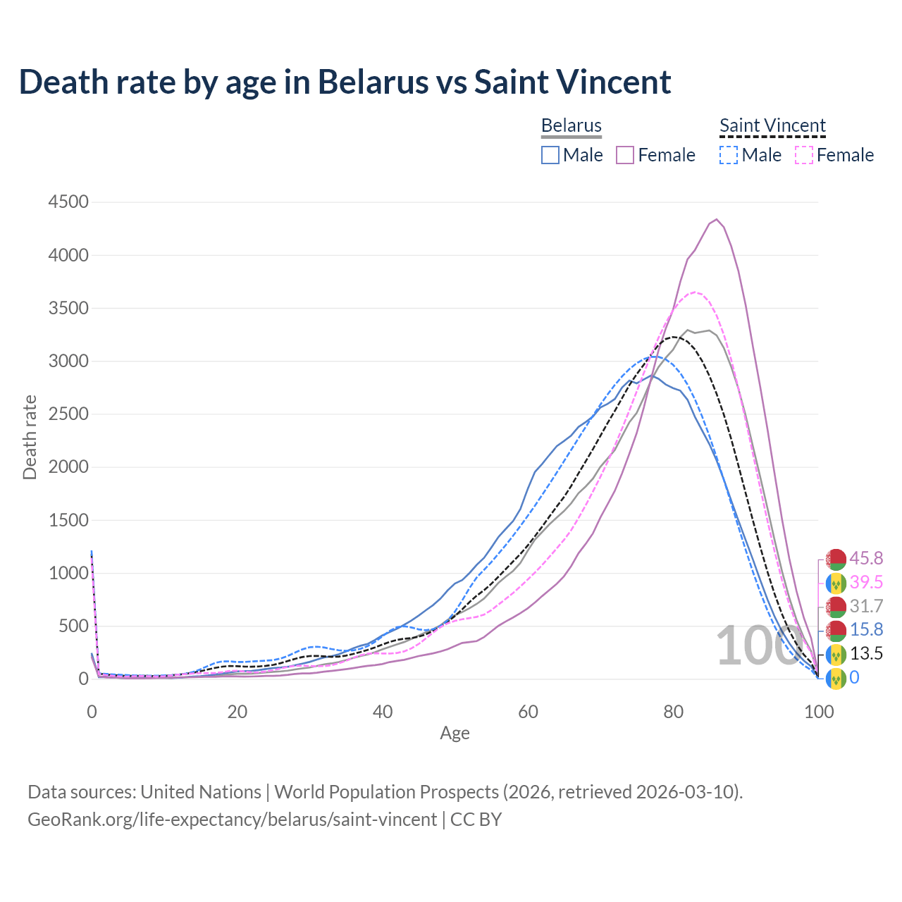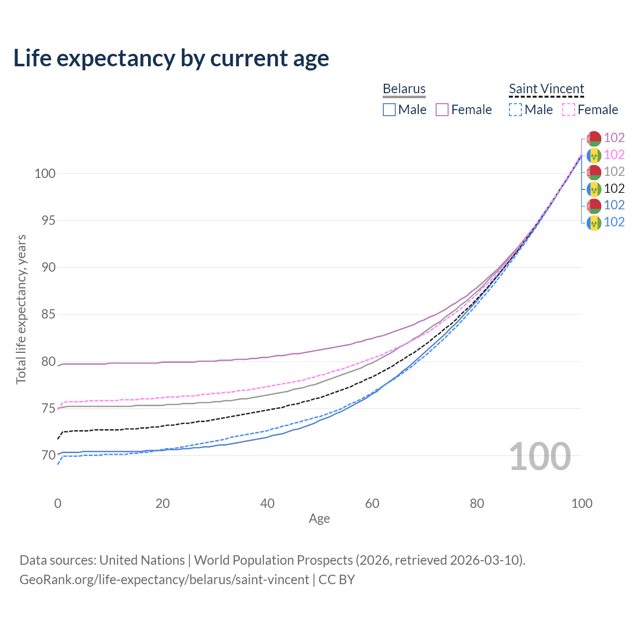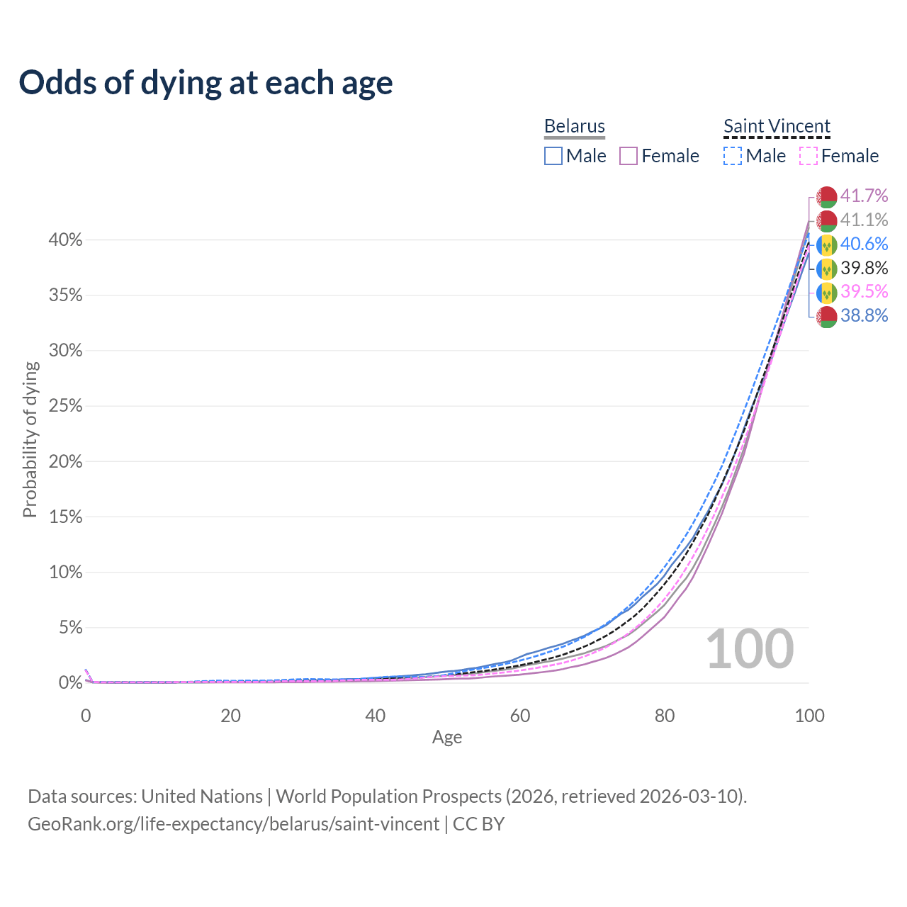 This life expectancy calculator shows the odds of living to 100, 95, 90, and below based on current age for both males and females in Belarus and Saint Vincent, along with mean and median age of death. The calculations are based on the 2026 life tables (actuarial tables) from the UN World Population Prospects.