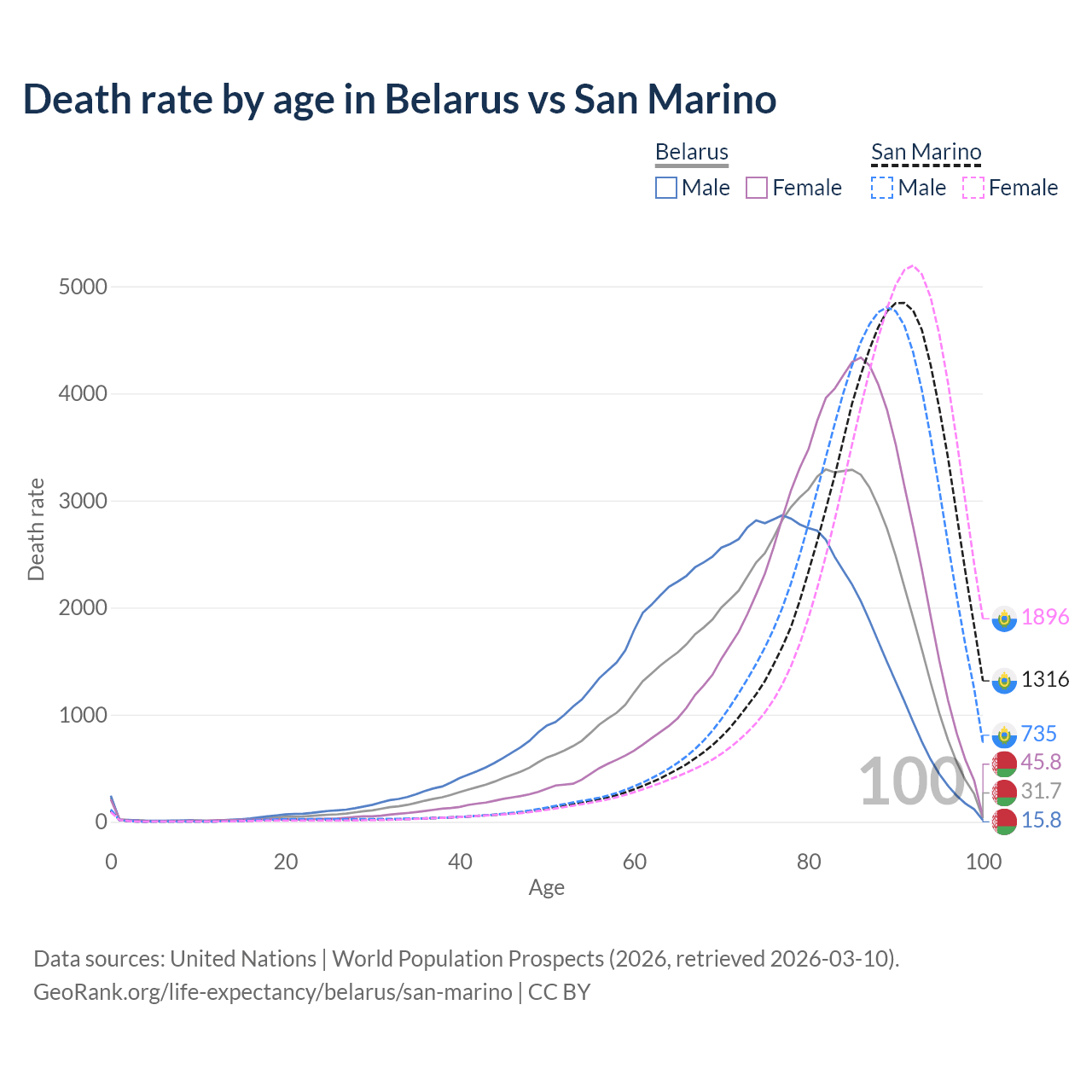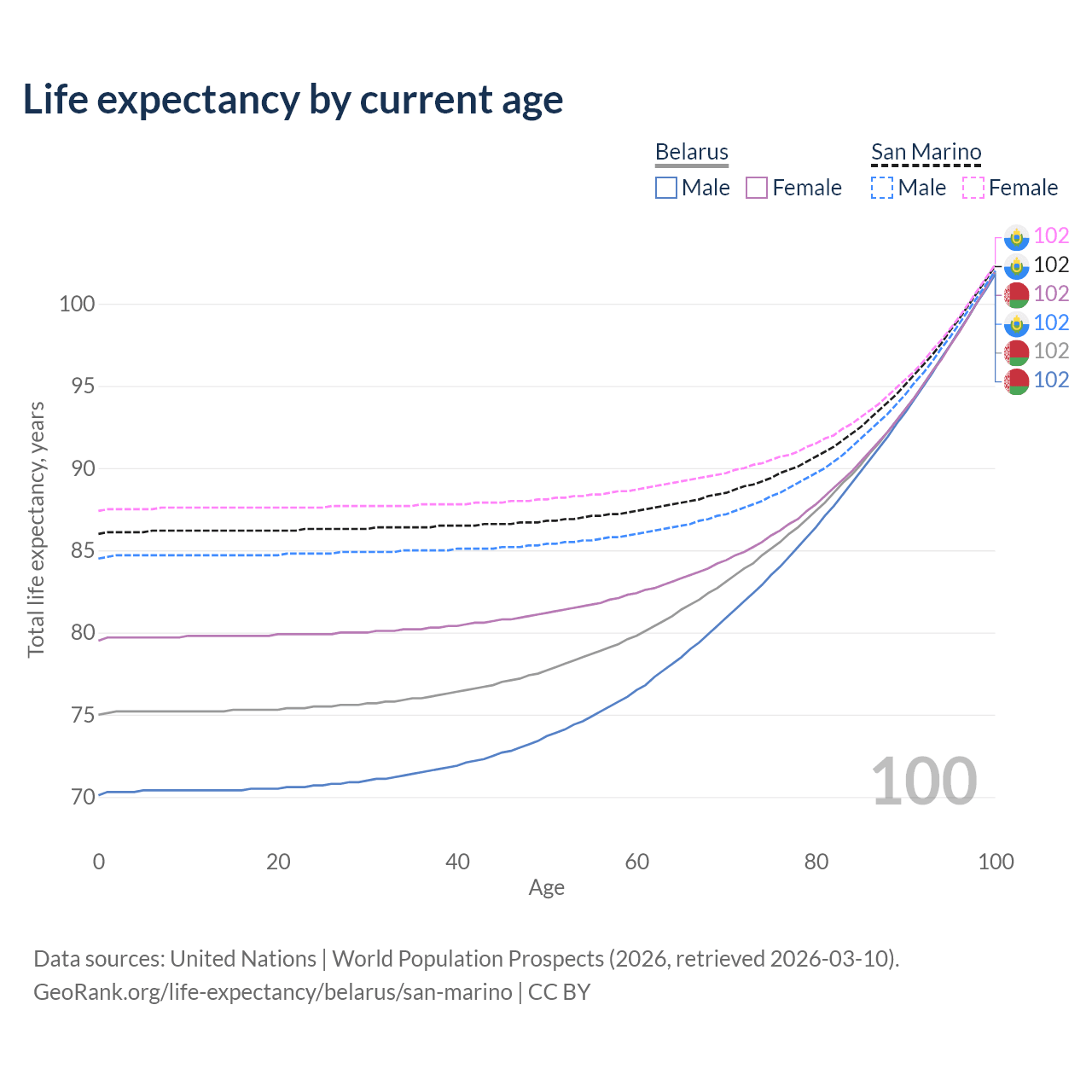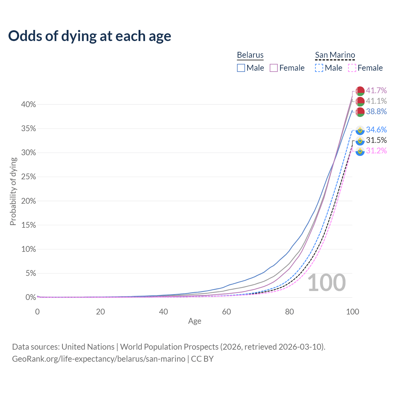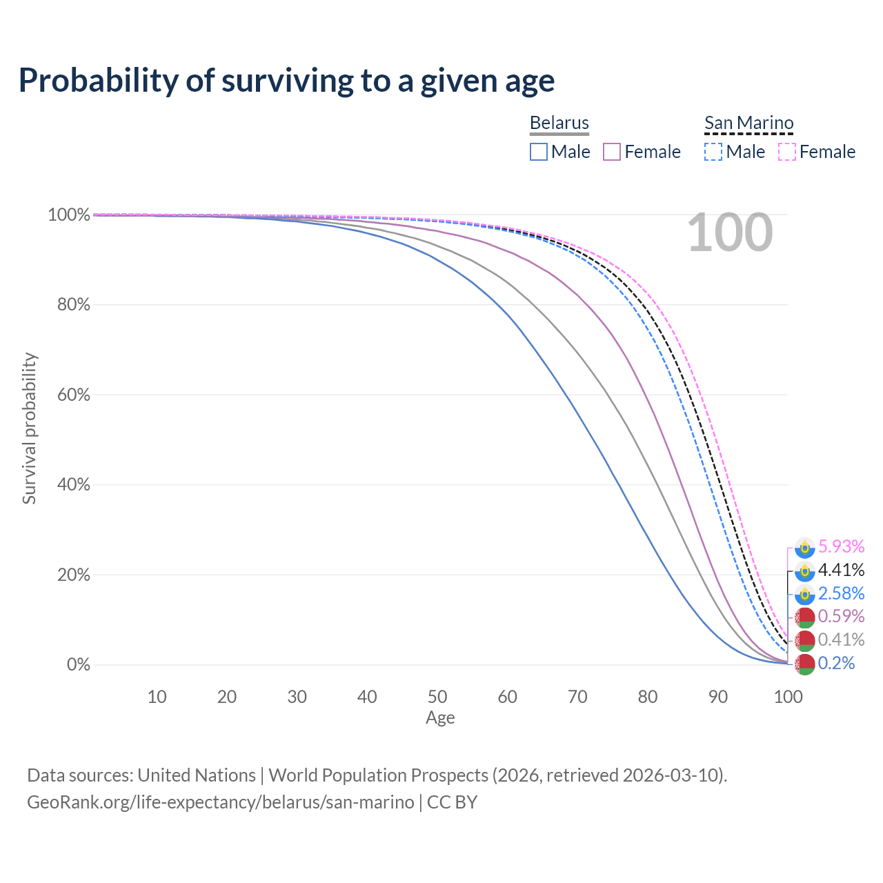 This life expectancy calculator shows the odds of living to 100, 95, 90, and below based on current age for both males and females in Belarus and San Marino, along with mean and median age of death. The calculations are based on the 2026 life tables (actuarial tables) from the UN World Population Prospects.