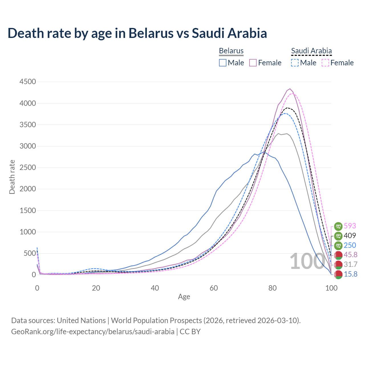 In Belarus, the most common age of death is 82, compared to 85 in Saudi Arabia. The median age of death is 78.1 in Belarus and 82.5 in Saudi Arabia, meaning only half of each cohort is expected to live past that age.