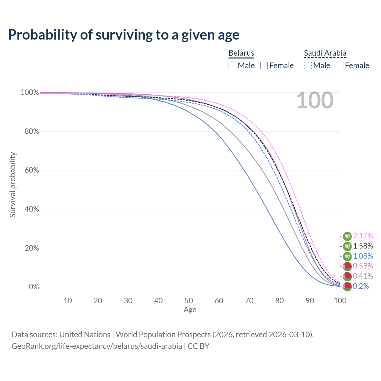 This life expectancy calculator shows the odds of living to 100, 95, 90, and below based on current age for both males and females in Belarus and Saudi Arabia, along with mean and median age of death. The calculations are based on the 2026 life tables (actuarial tables) from the UN World Population Prospects.