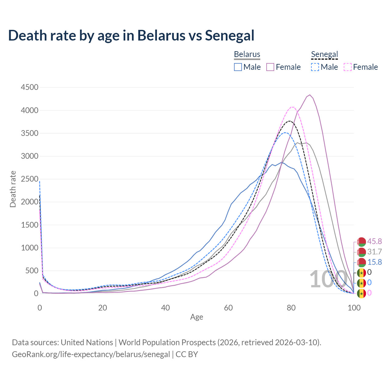In Belarus, the most common age of death is 82, compared to 80 in Senegal. The median age of death is 78.1 in Belarus and 75 in Senegal, meaning only half of each cohort is expected to live past that age.
