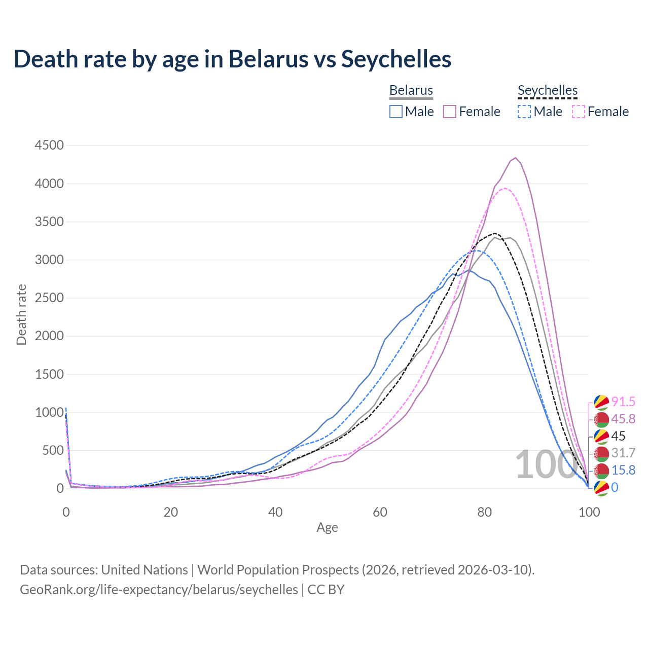 This life expectancy calculator shows the odds of living to 100, 95, 90, and below based on current age for both males and females in Belarus and the Seychelles, along with mean and median age of death. The calculations are based on the 2026 life tables (actuarial tables) from the UN World Population Prospects.