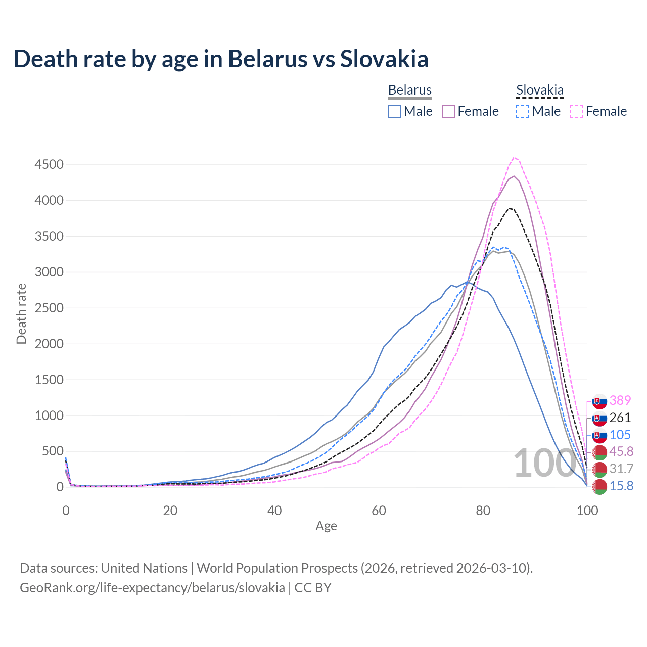 This life expectancy calculator shows the odds of living to 100, 95, 90, and below based on current age for both males and females in Belarus and Slovakia, along with mean and median age of death. The calculations are based on the 2026 life tables (actuarial tables) from the UN World Population Prospects.