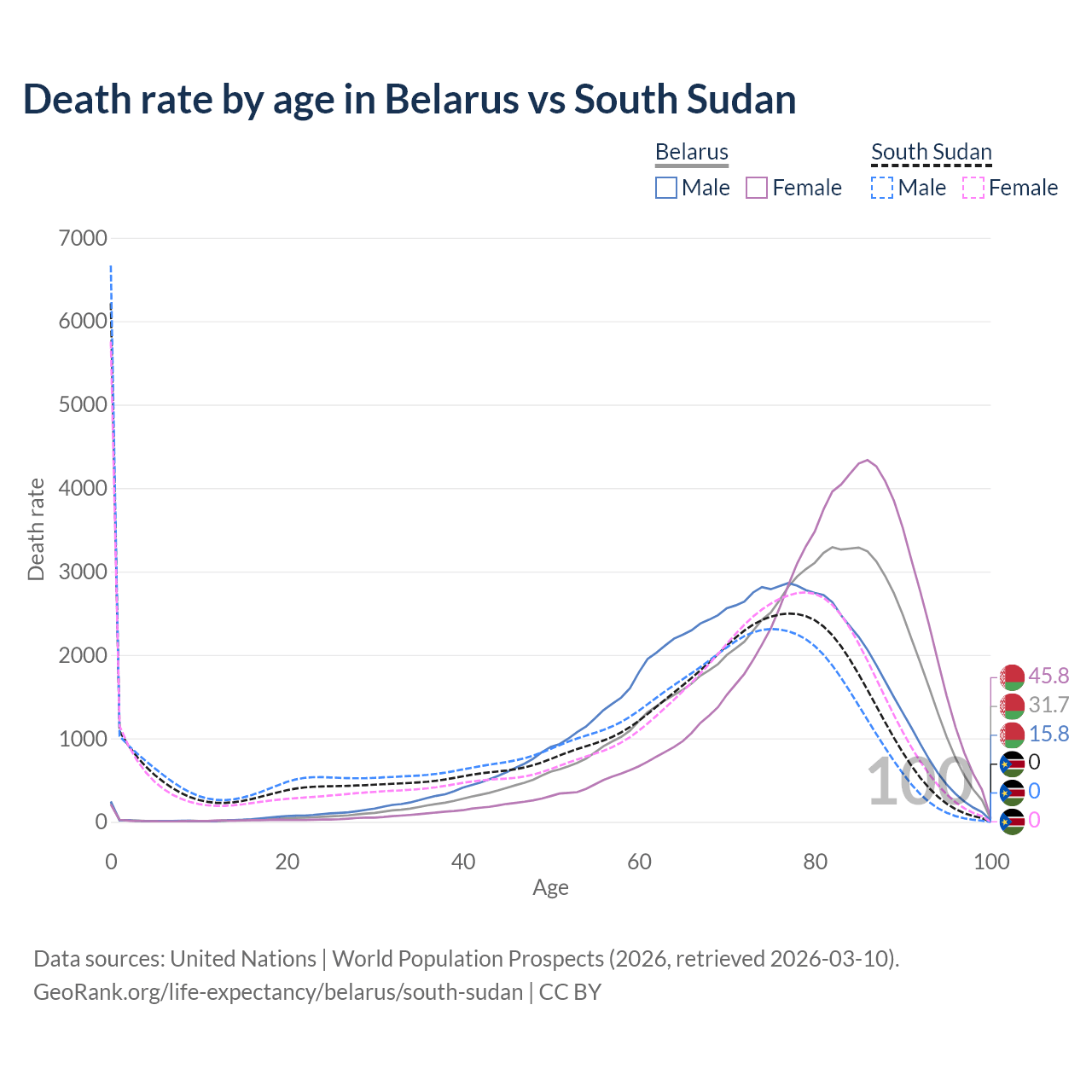 In Belarus, the most common age of death is 82, compared to 0 in South Sudan. The median age of death is 78.1 in Belarus and 67.5 in South Sudan, meaning only half of each cohort is expected to live past that age.