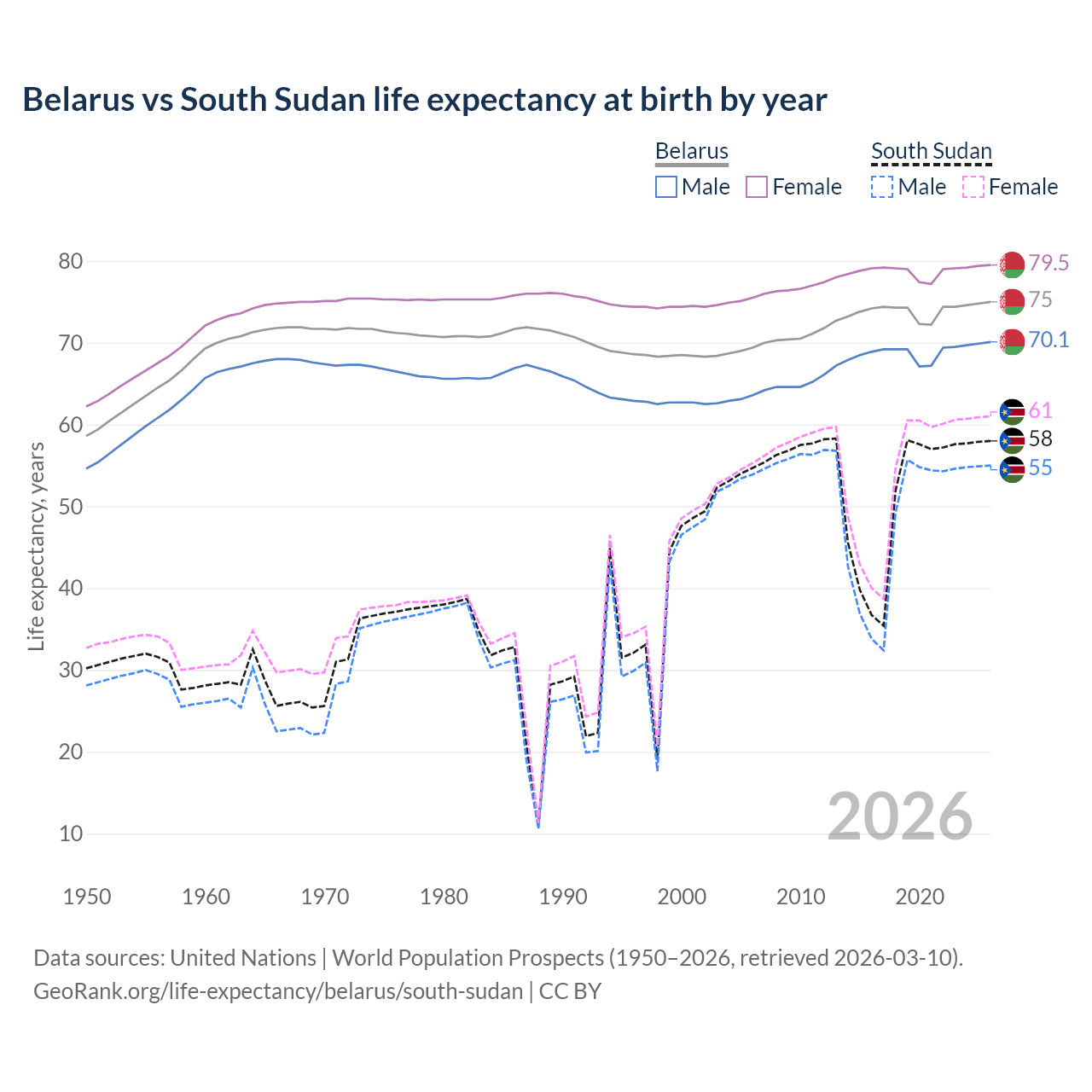 The average life expectancy at birth is 75 years in Belarus vs 58 in South Sudan. Belarus is ranked 97/197 by life expectancy, and South Sudan is 195/197. In Belarus, the life expectancy is 70.1 years for males and 79.5 years for females. In South Sudan, it's 55 years for males and 61 years for females.