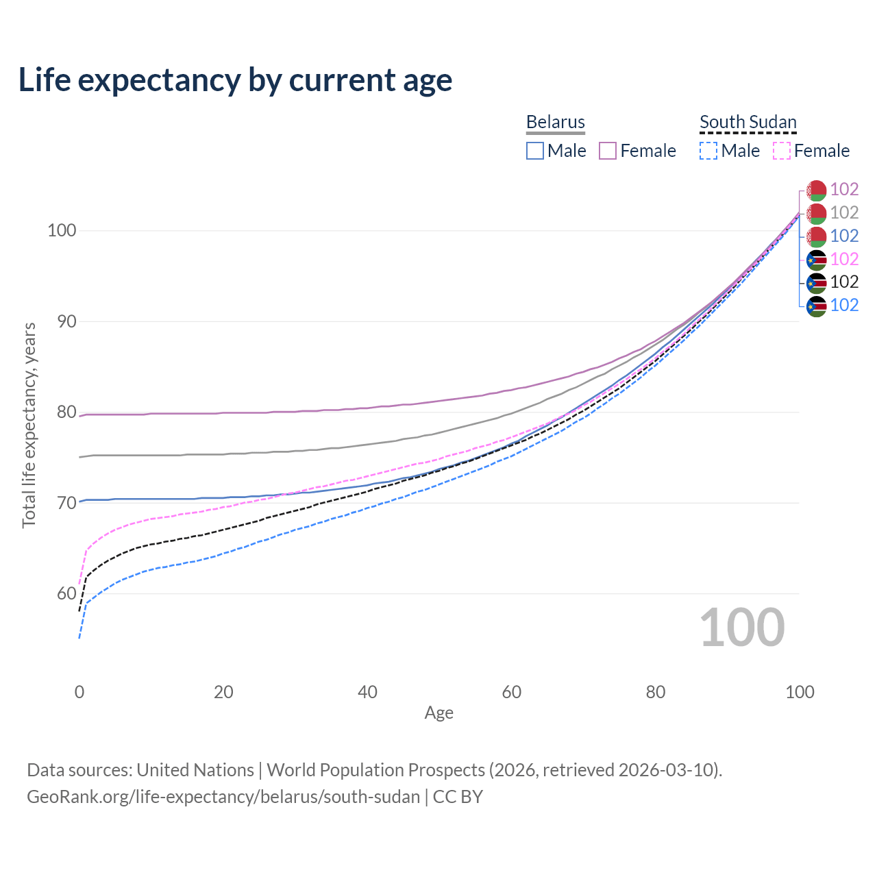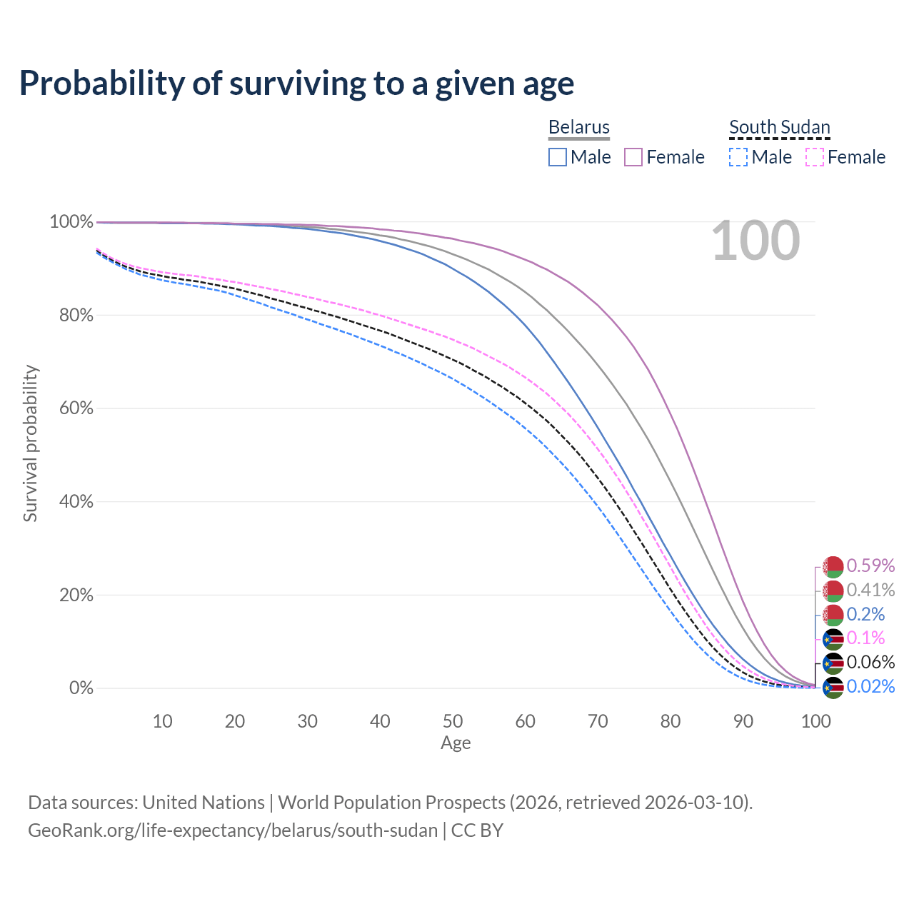 This life expectancy calculator shows the odds of living to 100, 95, 90, and below based on current age for both males and females in Belarus and South Sudan, along with mean and median age of death. The calculations are based on the 2026 life tables (actuarial tables) from the UN World Population Prospects.