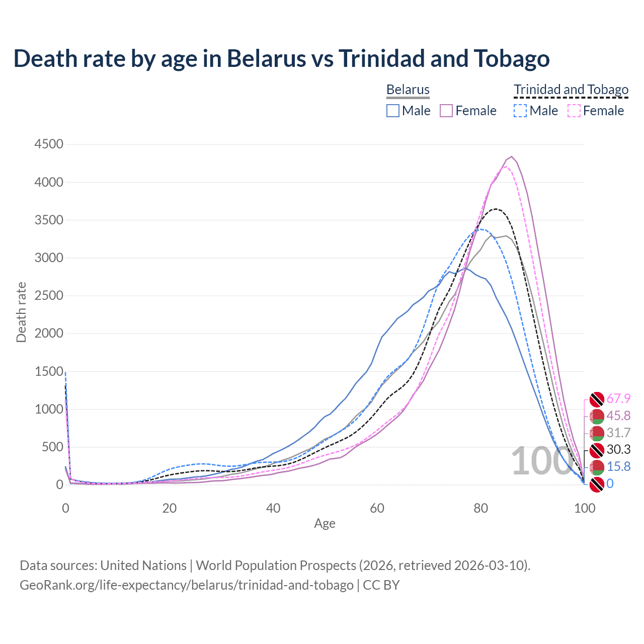 In Belarus, the most common age of death is 82, compared to 83 in Trinidad and Tobago. The median age of death is 78.1 in Belarus and 78.4 in Trinidad and Tobago, meaning only half of each cohort is expected to live past that age.