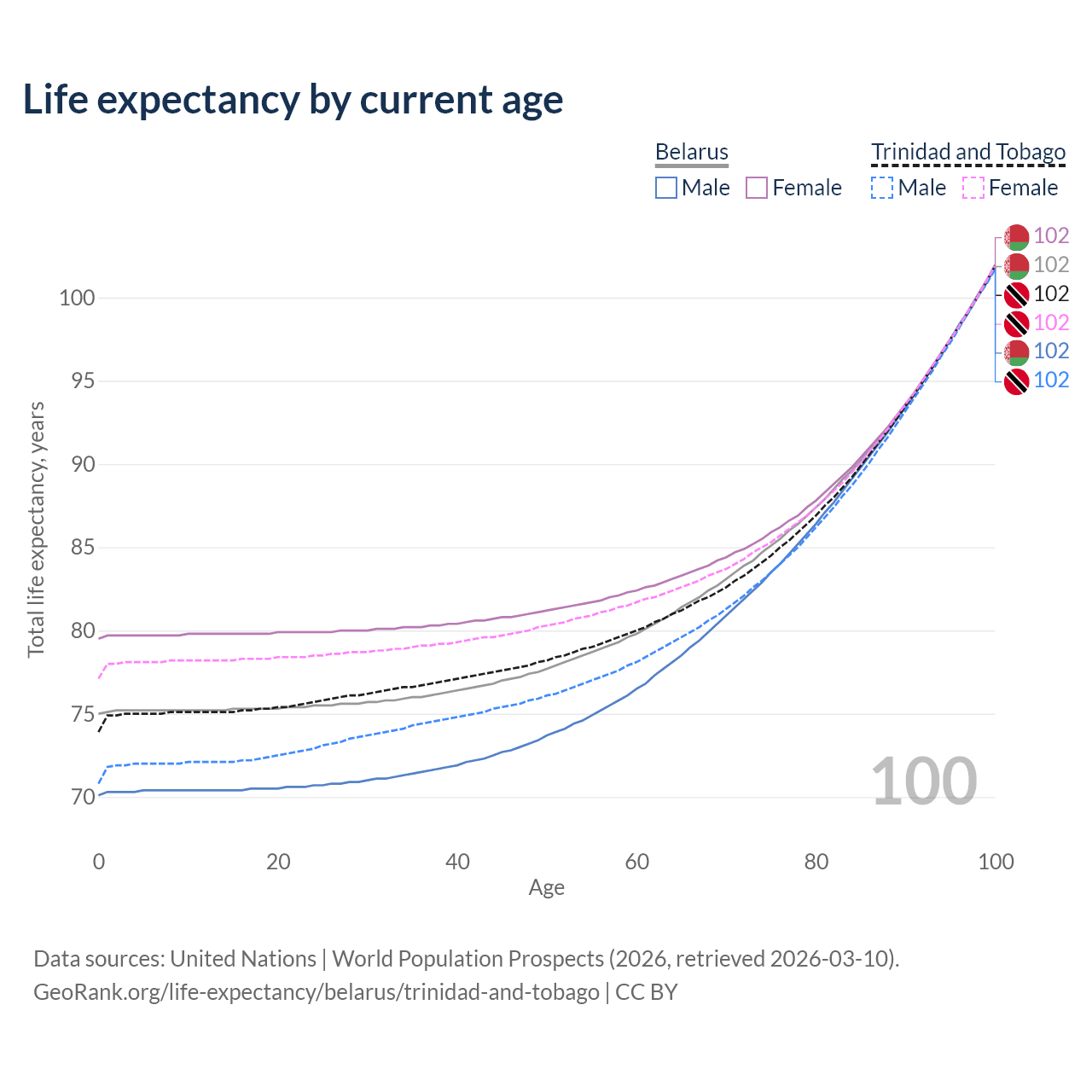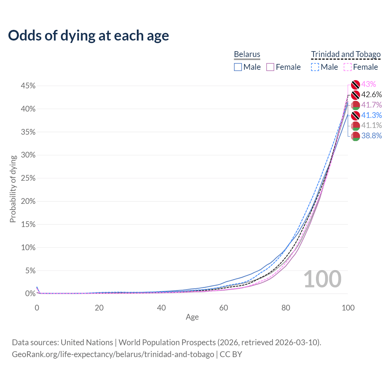This life expectancy calculator shows the odds of living to 100, 95, 90, and below based on current age for both males and females in Belarus and Trinidad and Tobago, along with mean and median age of death. The calculations are based on the 2026 life tables (actuarial tables) from the UN World Population Prospects.