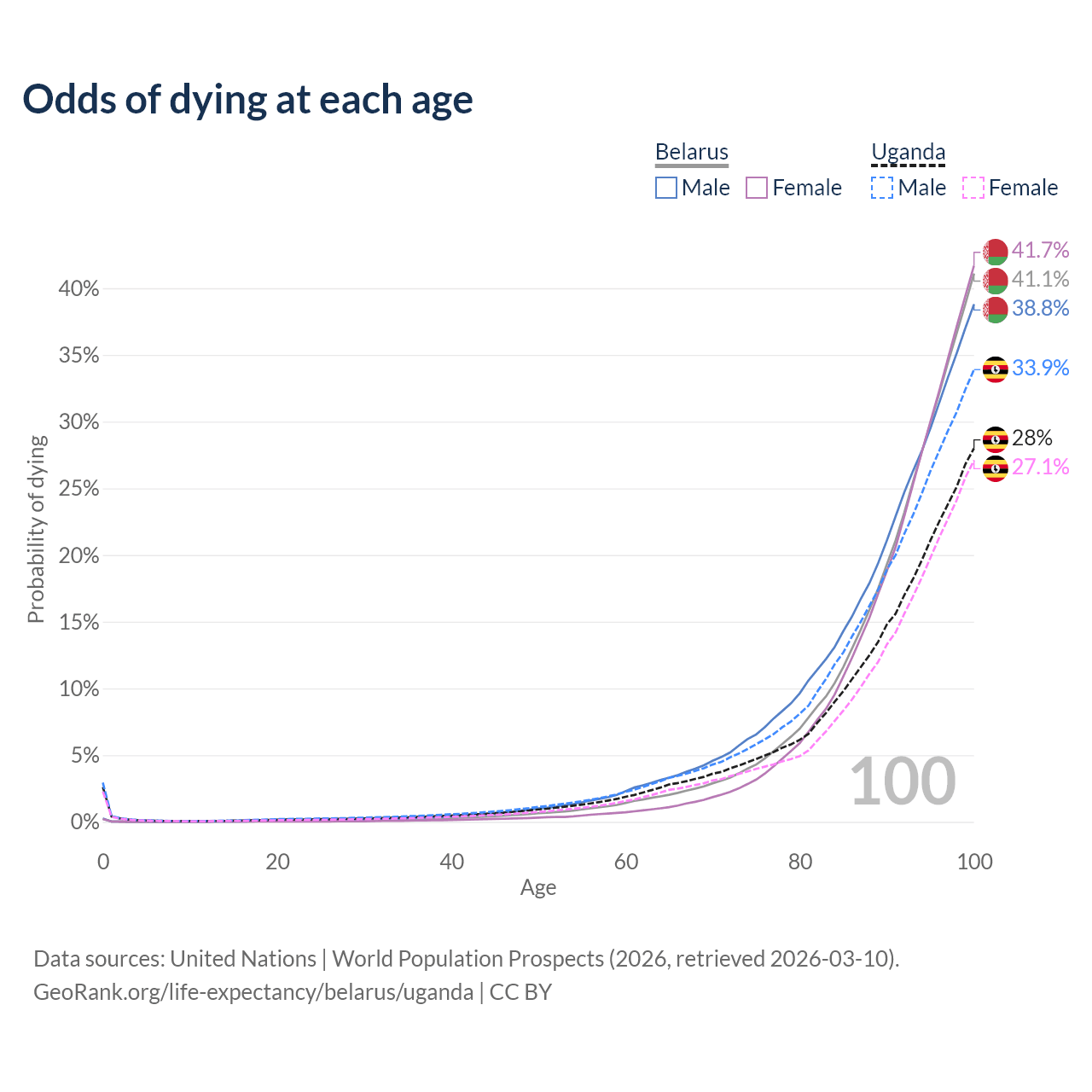 This life expectancy calculator shows the odds of living to 100, 95, 90, and below based on current age for both males and females in Belarus and Uganda, along with mean and median age of death. The calculations are based on the 2026 life tables (actuarial tables) from the UN World Population Prospects.
