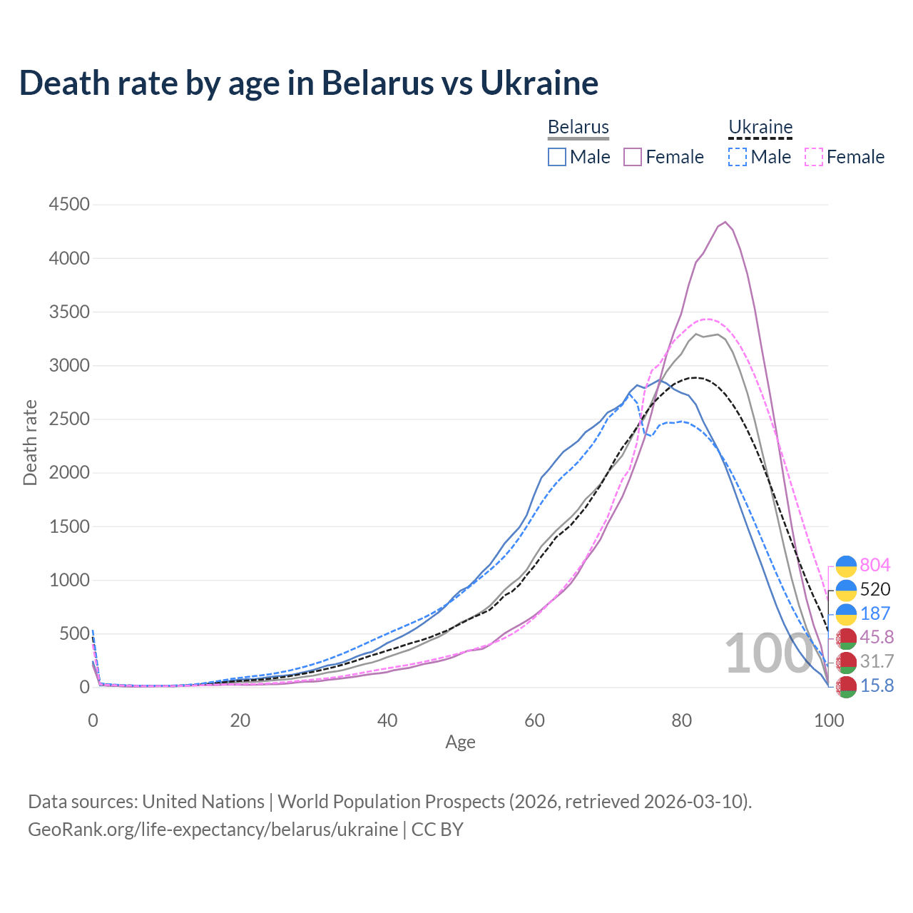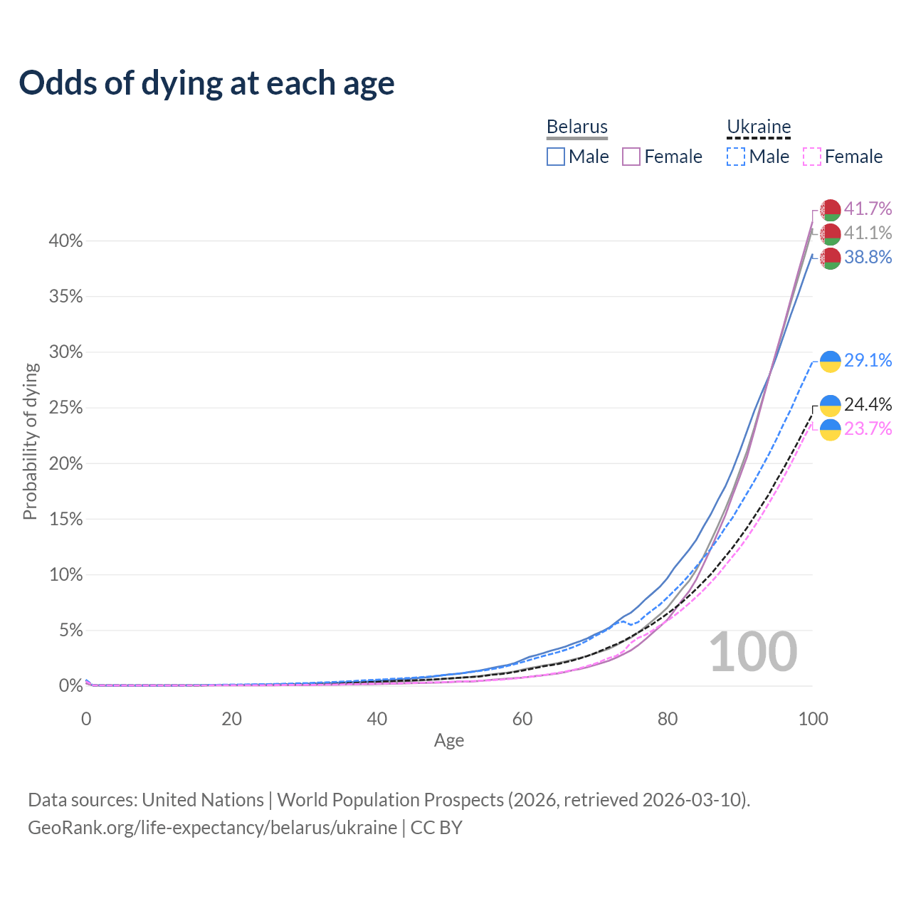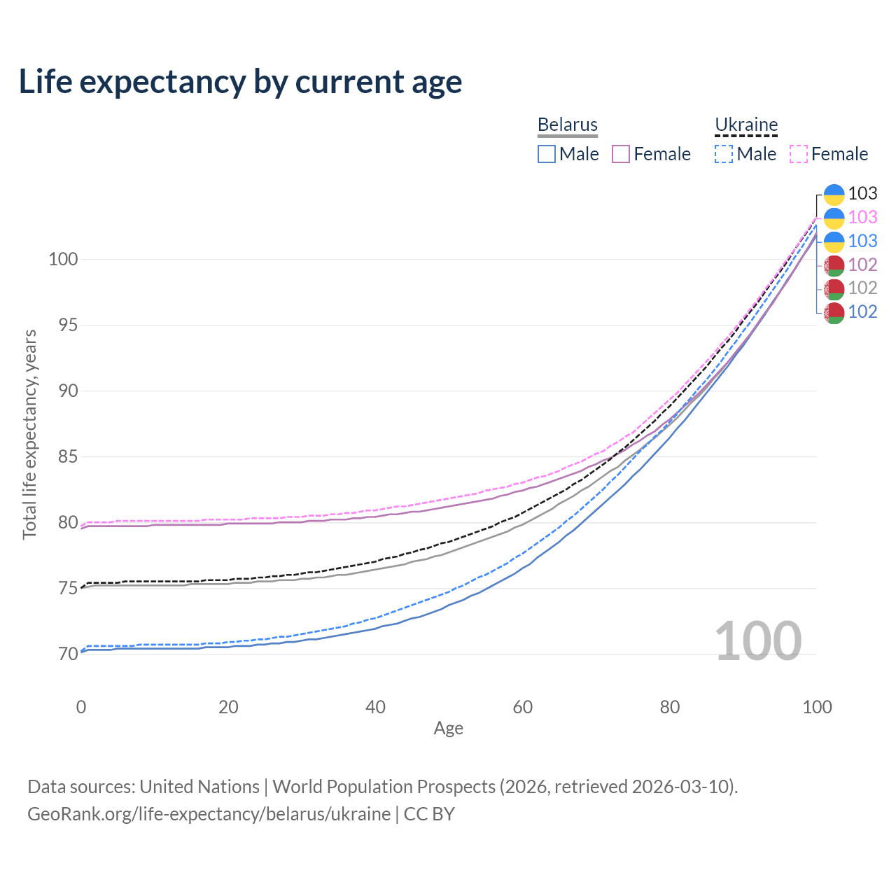 This life expectancy calculator shows the odds of living to 100, 95, 90, and below based on current age for both males and females in Belarus and Ukraine, along with mean and median age of death. The calculations are based on the 2026 life tables (actuarial tables) from the UN World Population Prospects.