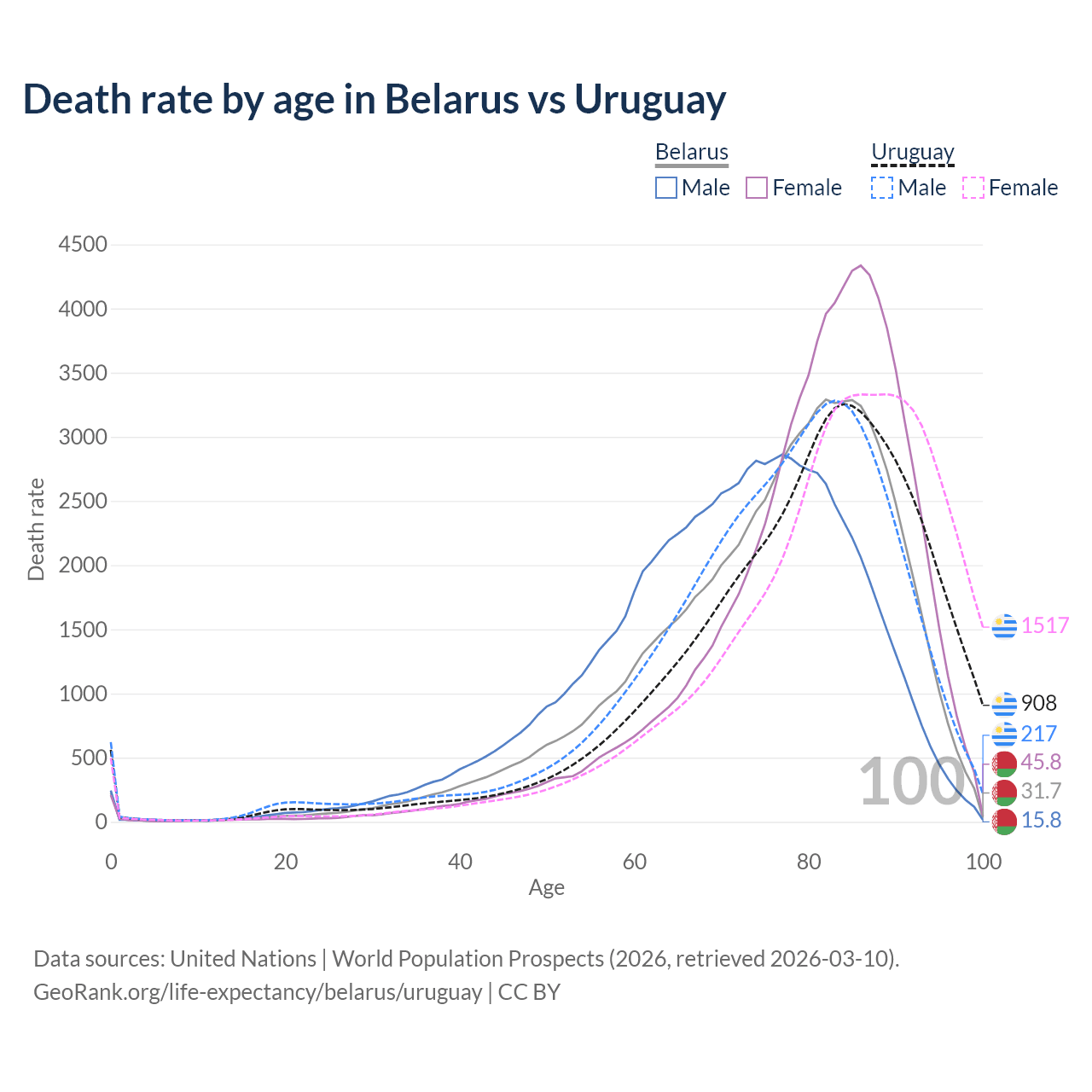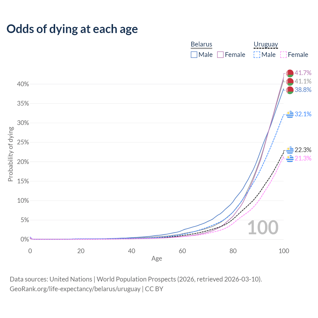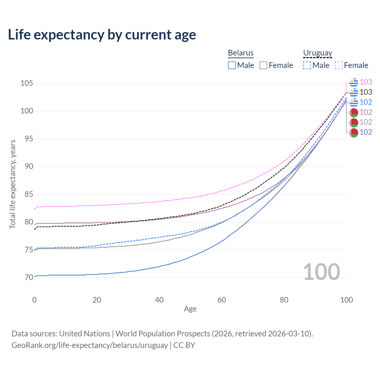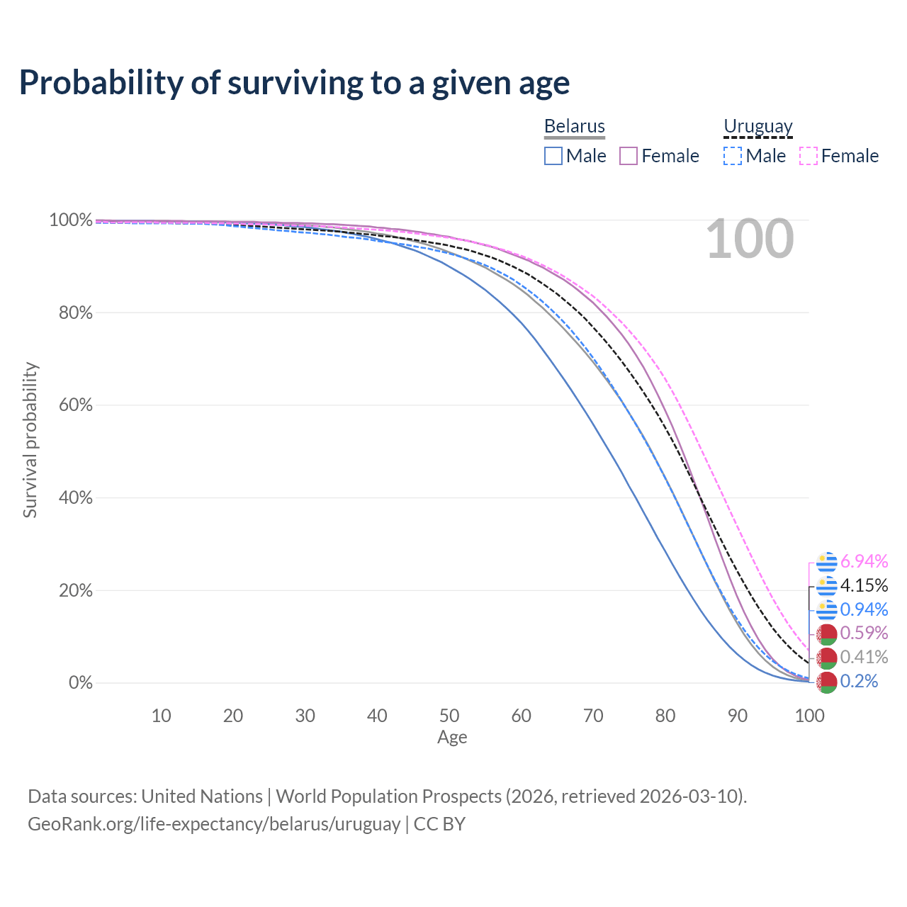 This life expectancy calculator shows the odds of living to 100, 95, 90, and below based on current age for both males and females in Belarus and Uruguay, along with mean and median age of death. The calculations are based on the 2026 life tables (actuarial tables) from the UN World Population Prospects.
