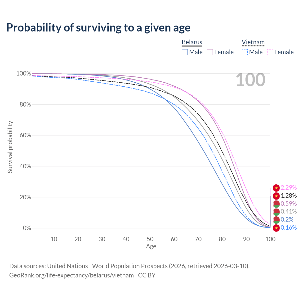 This life expectancy calculator shows the odds of living to 100, 95, 90, and below based on current age for both males and females in Belarus and Vietnam, along with mean and median age of death. The calculations are based on the 2026 life tables (actuarial tables) from the UN World Population Prospects.