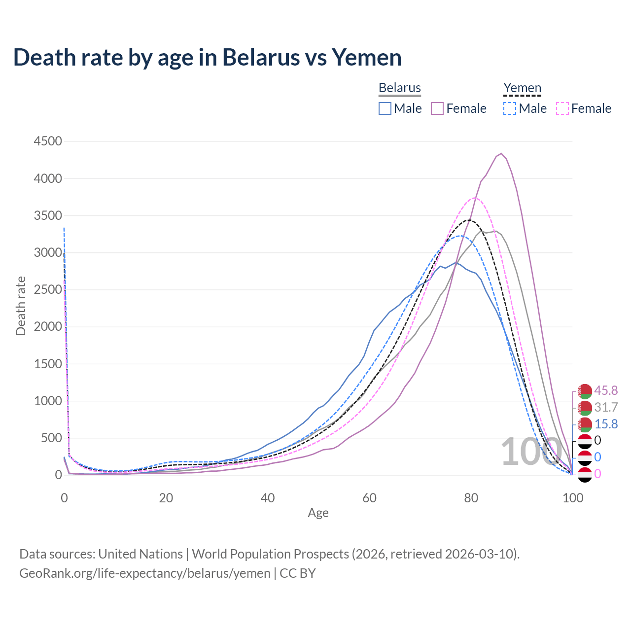 In Belarus, the most common age of death is 82, compared to 80 in Yemen. The median age of death is 78.1 in Belarus and 74.9 in Yemen, meaning only half of each cohort is expected to live past that age.