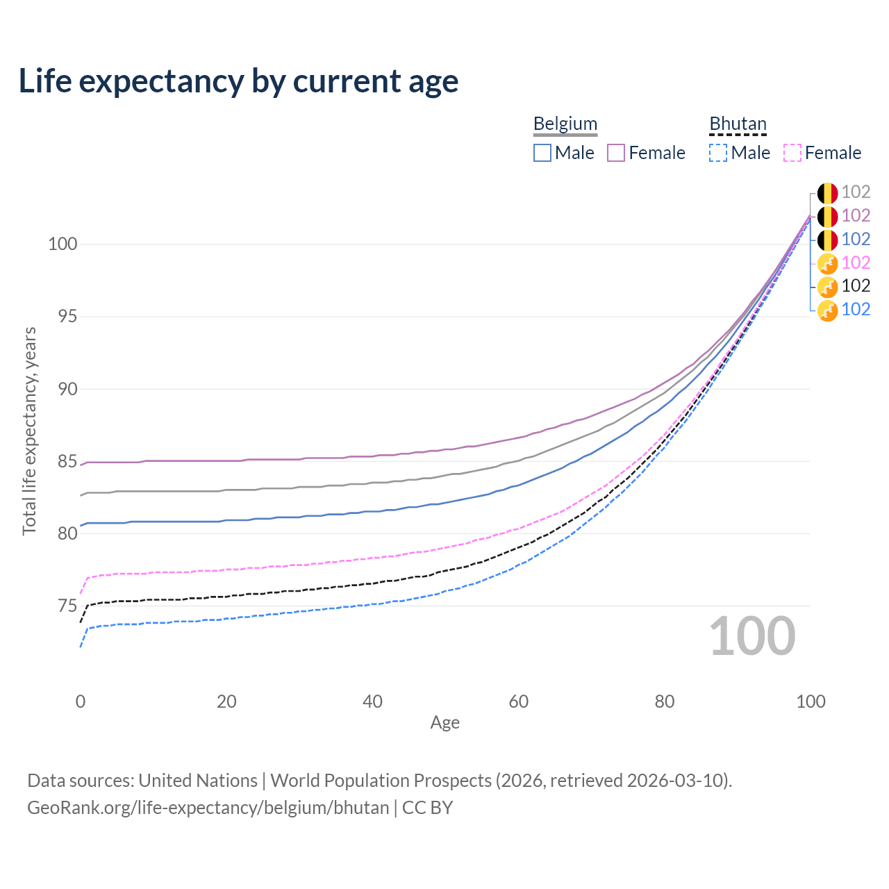 This life expectancy calculator shows the odds of living to 100, 95, 90, and below based on current age for both males and females in Belgium and Bhutan, along with mean and median age of death. The calculations are based on the 2026 life tables (actuarial tables) from the UN World Population Prospects.