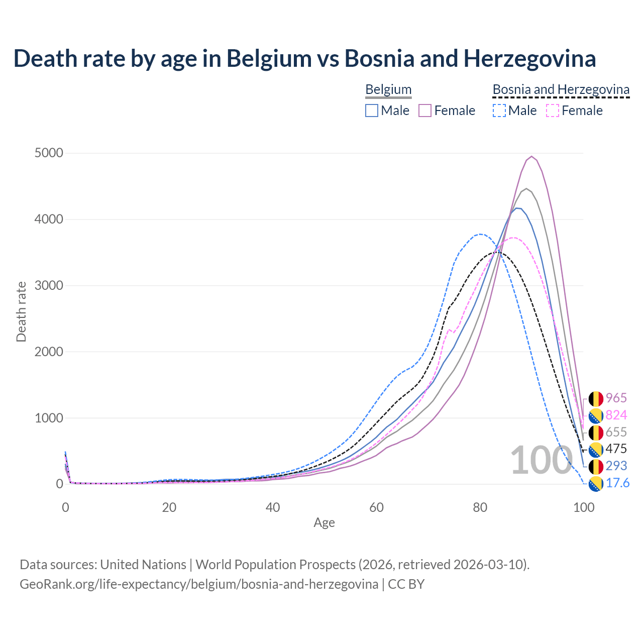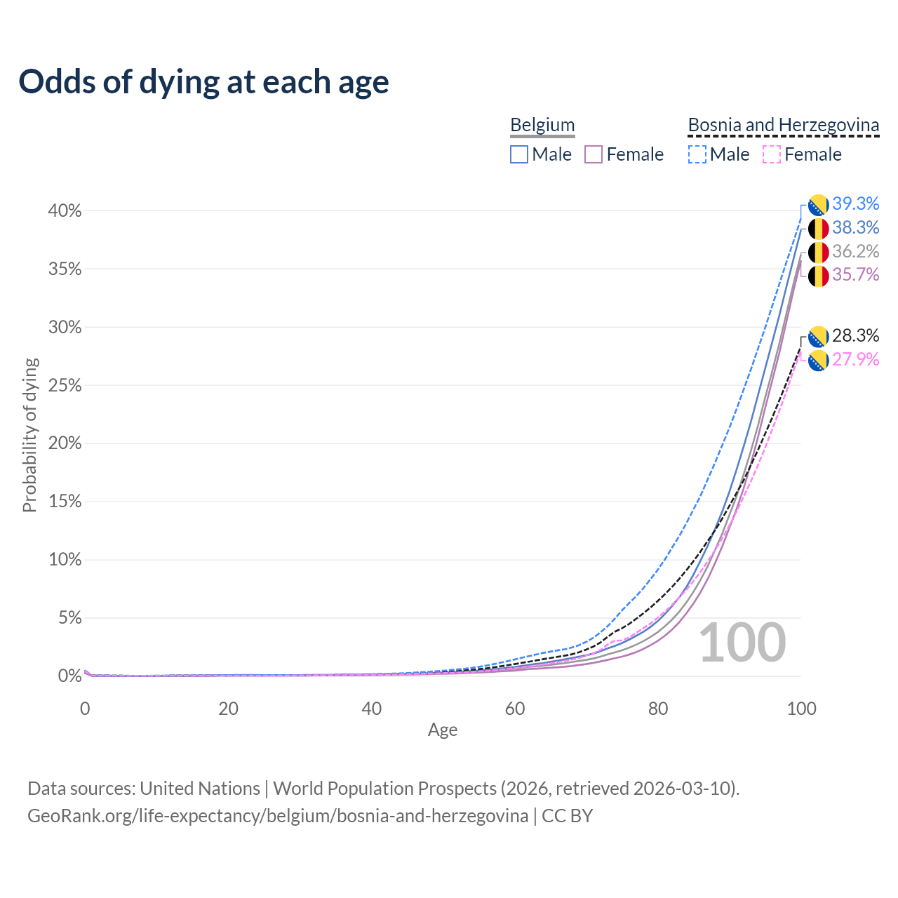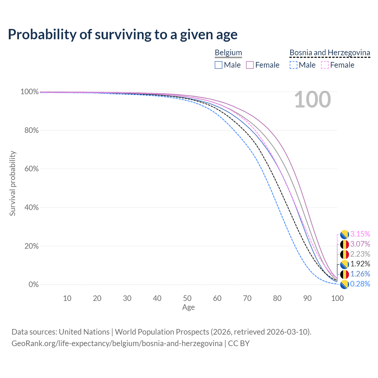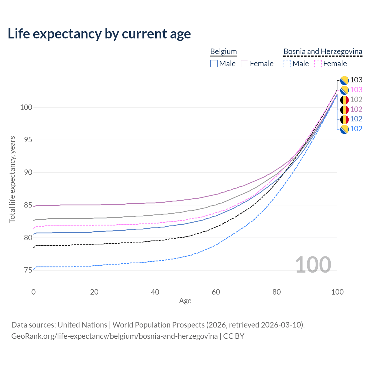 This life expectancy calculator shows the odds of living to 100, 95, 90, and below based on current age for both males and females in Belgium and Bosnia and Herzegovina, along with mean and median age of death. The calculations are based on the 2026 life tables (actuarial tables) from the UN World Population Prospects.