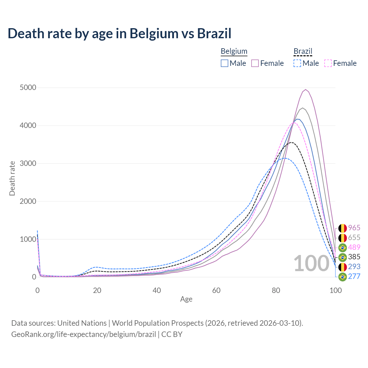 In Belgium, the most common age of death is 89, compared to 85 in Brazil. The median age of death is 85.8 in Belgium and 80.8 in Brazil, meaning only half of each cohort is expected to live past that age.